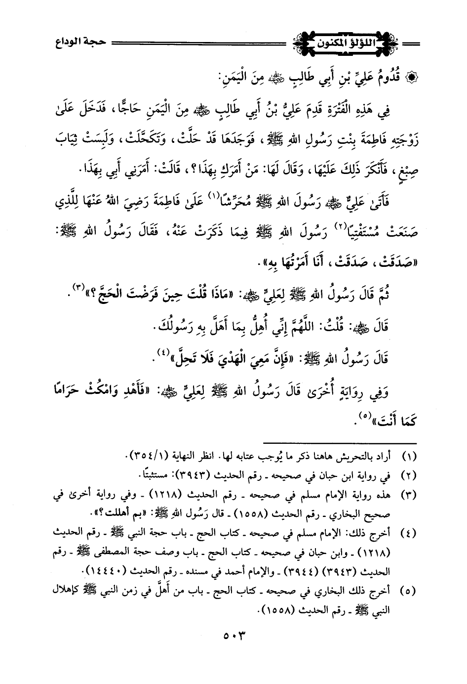 (¬1) أخرج ذلك مسلم في صحيحه - كتاب الحج - باب حجة النبي -صلى اللَّه عليه وسلم- رقم الحديث (1218) - والإمام أحمد في مسنده - رقم الحديث (14440) - وابن حبان في صحيحه - كتاب الحج - باب ذكر وصف حجة النبي -صلى اللَّه عليه وسلم- رقم الحديث (3791) (3943).