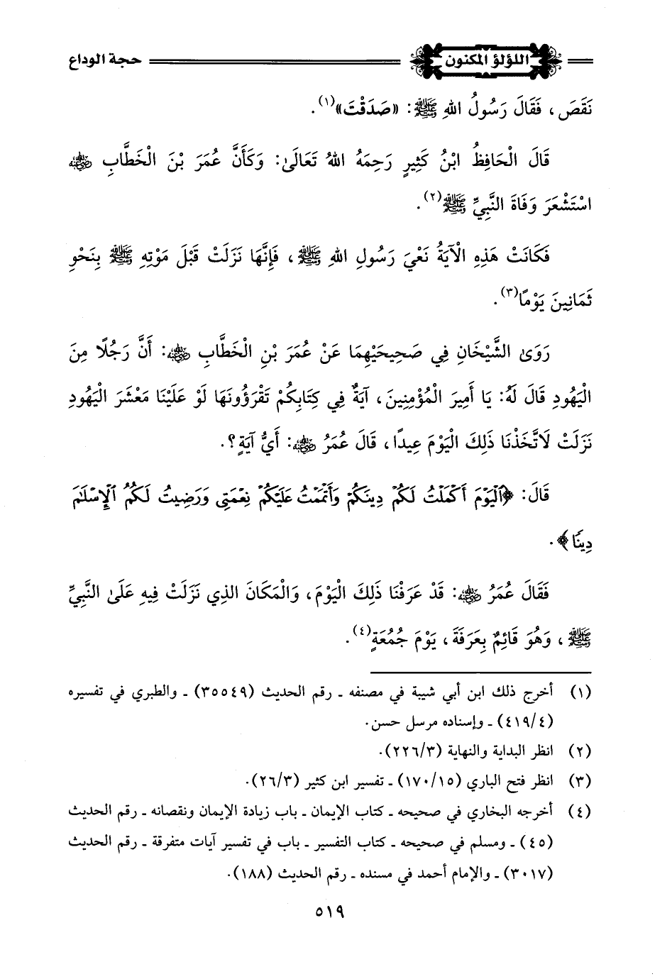 قَالَ الْحَافِظُ ابْنُ كَثِيرٍ فِي تَفْسِيرِ هَذِهِ الْآيَةِ: هَذِهِ أَكْبْرُ نِعَمِ اللَّهِ عَزَّ وَجَلَّ عَلَى هَذِهِ الْأُمَّةِ، حَيْثُ أَكْمَلَ تَعَالَى لَهُمْ دِينَهُمْ، فَلَا يَحْتَاجُونَ إِلَى دِينٍ غَيْرِهِ، وَلَا إِلَى نَبِيٍّ غَيْرِ نَبِيِّهِمْ -صلى اللَّه عليه وسلم-، وَلهَذَا جَعَلَهُ اللَّهُ تَعَالَى خَاتَمَ الْأَنْبِيَاءِ، وَبَعَثَهُ إِلَى الْإِنْسِ وَالْجِنِّ، فَلَا حَلَالَ إِلَّا مَا أَحَلَّهُ، وَلَا حَرَامَ إِلَّا مَا حَرَّمَهُ، وَلَا دِينَ إِلَّا مَا شَرَعَهُ، وَكُلُّ شَيْءٍ أَخْبَرَ بِهِ فَهُوَ حَقٌّ، وَصِدْقٌ، وَلَا كَذِبَ فِيهِ وَلَا خُلْفَ (¬1).