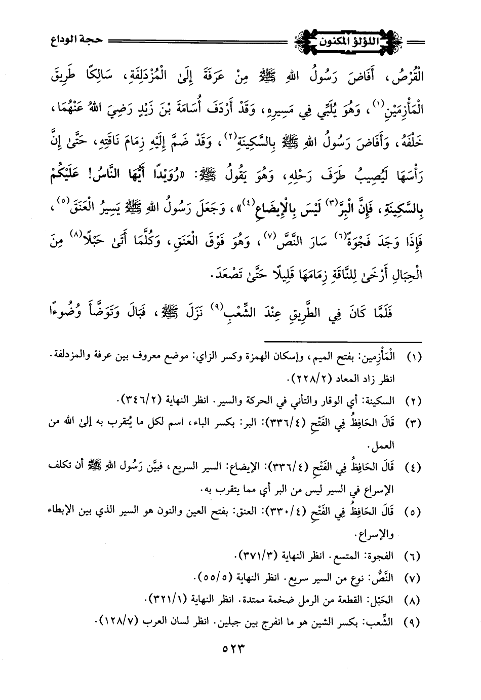 (¬3) أخرج ذلك البخاري في صحيحه - كتاب الحج - باب السير إذا دفع من عرفة - رقم الحديث (1666) - وباب النزول بين عرفة وجمع - رقم الحديث (1669) - وباب أمر النبي -صلى اللَّه عليه وسلم- بالسكينة عند الإفاضة - رقم الحديث (1671) - ومسلم في صحيحه - كتاب الحج - باب حجة النبي -صلى اللَّه عليه وسلم- رقم الحديث (1218) - والإمام أحمد في مسنده - رقم الحديث (6151) (21742) (21761).