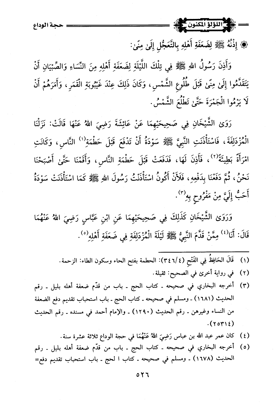 (¬5) أخرجه أبو داود في سننه - كتاب المناسك - باب التعجيل من جَمع - رقم الحديث (1940) - والإمام أحمد في مسنده - رقم الحديث (2082) (3003) - وابن ماجة في سننه - كتاب المناسك - باب من تقدم من جمع إلى منى لرمي الجمار - رقم الحديث (3025) - وأورده الحافظ في الفتح (4/ 344) - وحسن إسناده.