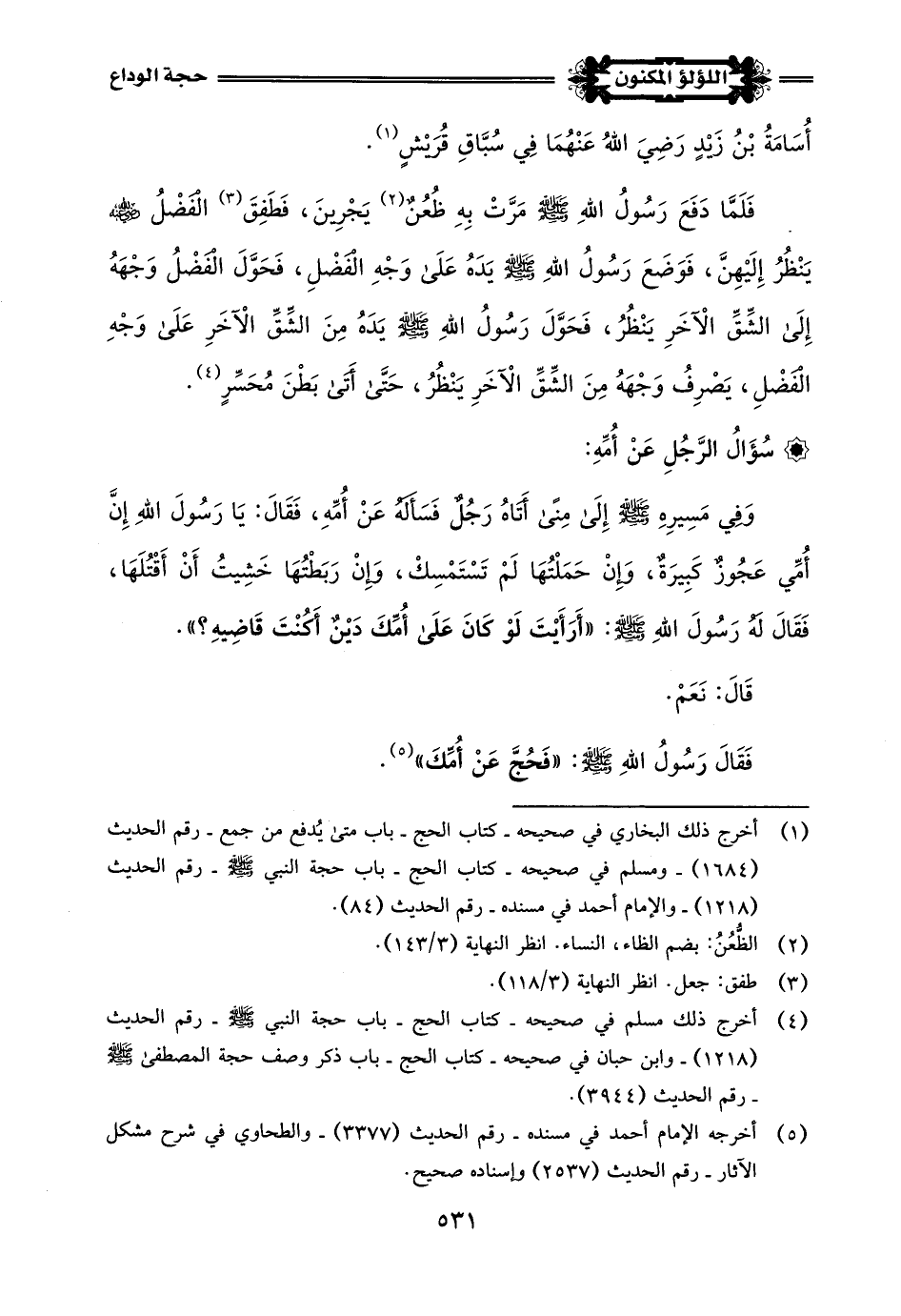 (¬2) أخرج ذلك الإمام مسلم في صحيحه - كتاب الحج - باب حجة النبي -رضي اللَّه عنه- رقم الحديث (1218) - والإمام أحمد في مسنده - رقم الحديث (14553) (21812).