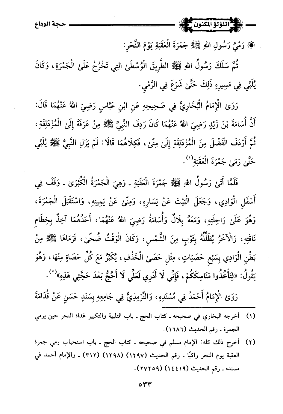 (¬1) أخرجه الإمام أحمد في مسنده - رقم الحديث (15411) - والترمذي في جامعه - كتاب الحج - باب ما جاء في كراهية طرد الناس عند رمي الجمار - رقم الحديث (919).