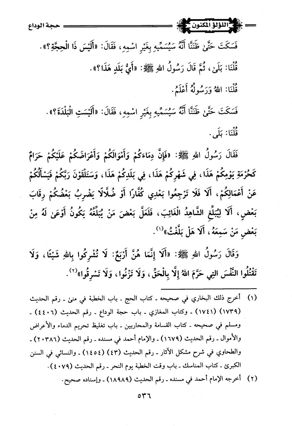(¬1) أخرج ذلك الإمام أحمد في مسنده - رقم الحديث (23497) - وابن ماجة في سننه - كتاب المناسك - باب الخطبة يوم النحر - رقم الحديث (3057) - والطحاوي في شرح مشكل الآثار - رقم الحديث (42) - وإسناده صحيح.