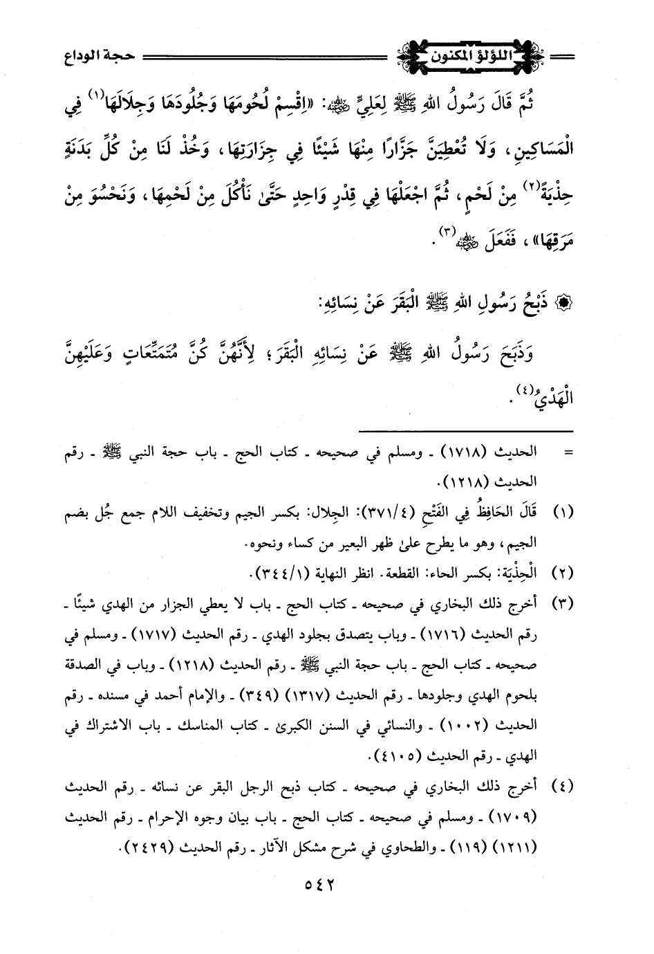 (¬4) أخرج ذلك البخاري في صحيحه - كتاب الحج - باب من ساق البدن معه - رقم الحديث (1691) - ومسلم في صحيحه - كتاب الحج - باب الاشتراك في الهدي - رقم الحديث (1318) (351) - والإمام أحمد في مسنده - رقم الحديث (14265).