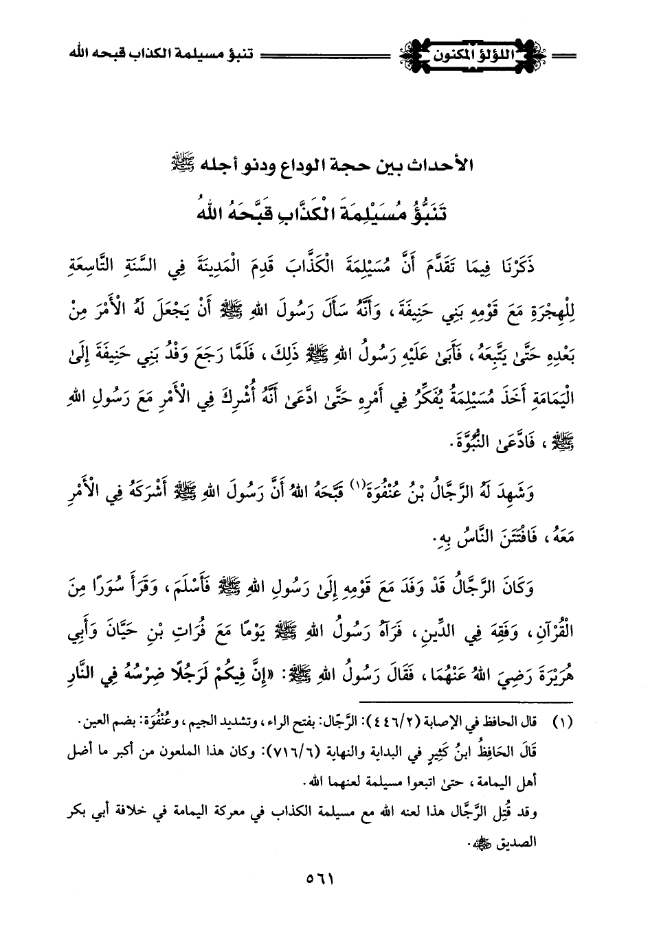 (¬4) أخرجه البخاري في صحيحه - كتاب المغازي - باب قصة الأسود العنسي - رقم الحديث (4379) - ومسلم في صحيحه - كتاب الرؤيا - باب رؤيا النبي -صلى اللَّه عليه وسلم- رقم الحديث (2274).