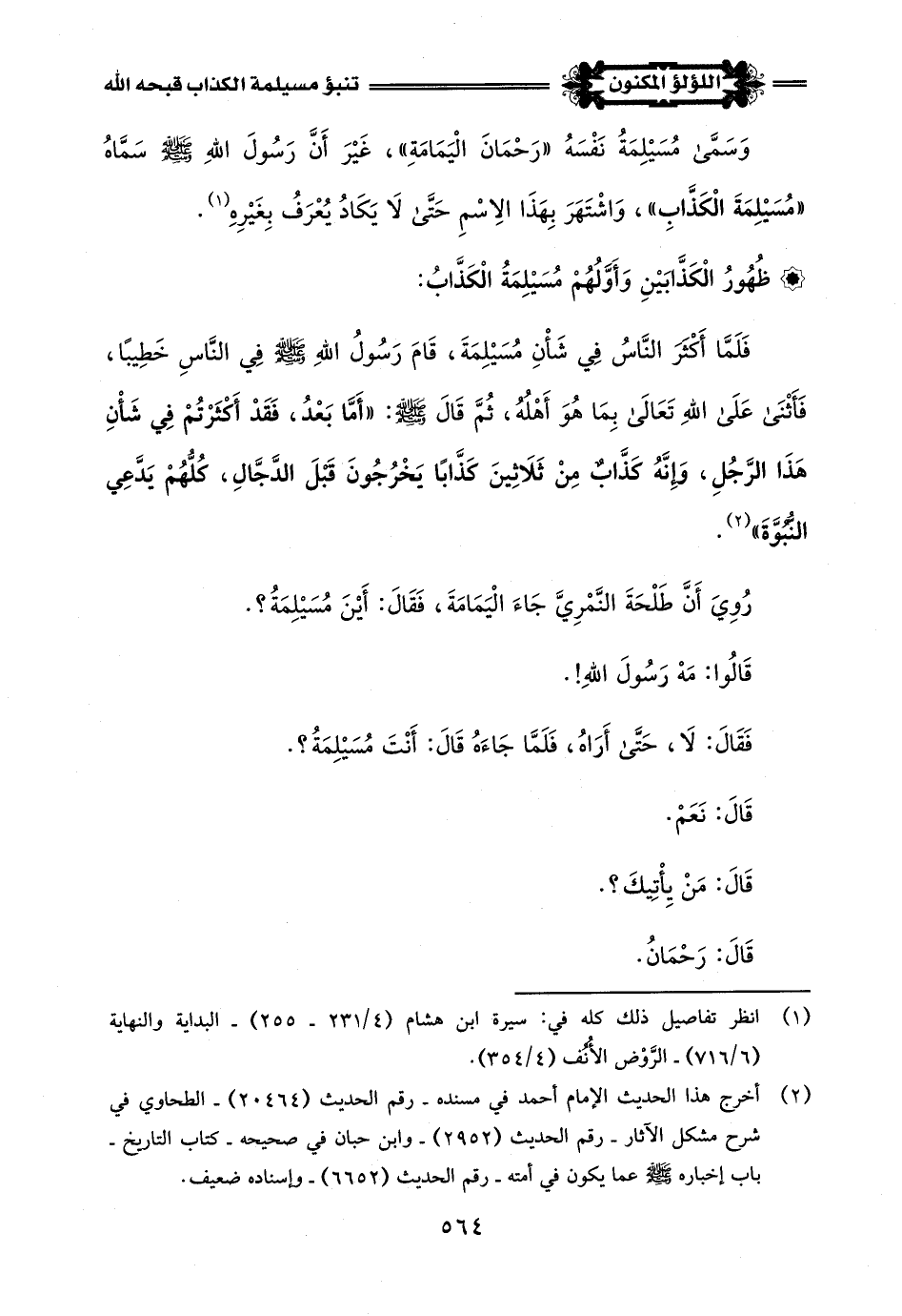 ثُمَّ كتَبَ مُسَيْلِمَةُ الْكَذَّابِ إِلَى رَسُولِ اللَّهِ -صلى اللَّه عليه وسلم- قَالَ فِيهِ: مِنْ مُسَيْلِمَةَ رَسُولِ اللَّهِ إِلَى مُحَمَّدٍ رَسُولِ اللَّهِ، سَلَامٌ عَلَيْكَ، أَمَّا بَعْدُ: فَإِنِّي قَدْ أُشْرِكْتُ في الْأَمْرِ مَعَكَ، وَإِنَّ لَنَا نِصْفُ الْأَرْضِ، وَلقُرَيْشٍ نِصْفُ الْأَرْضِ، وَلَكِنَّ قُرَيْشًا قَوْمٌ يَعْتَدُونَ.