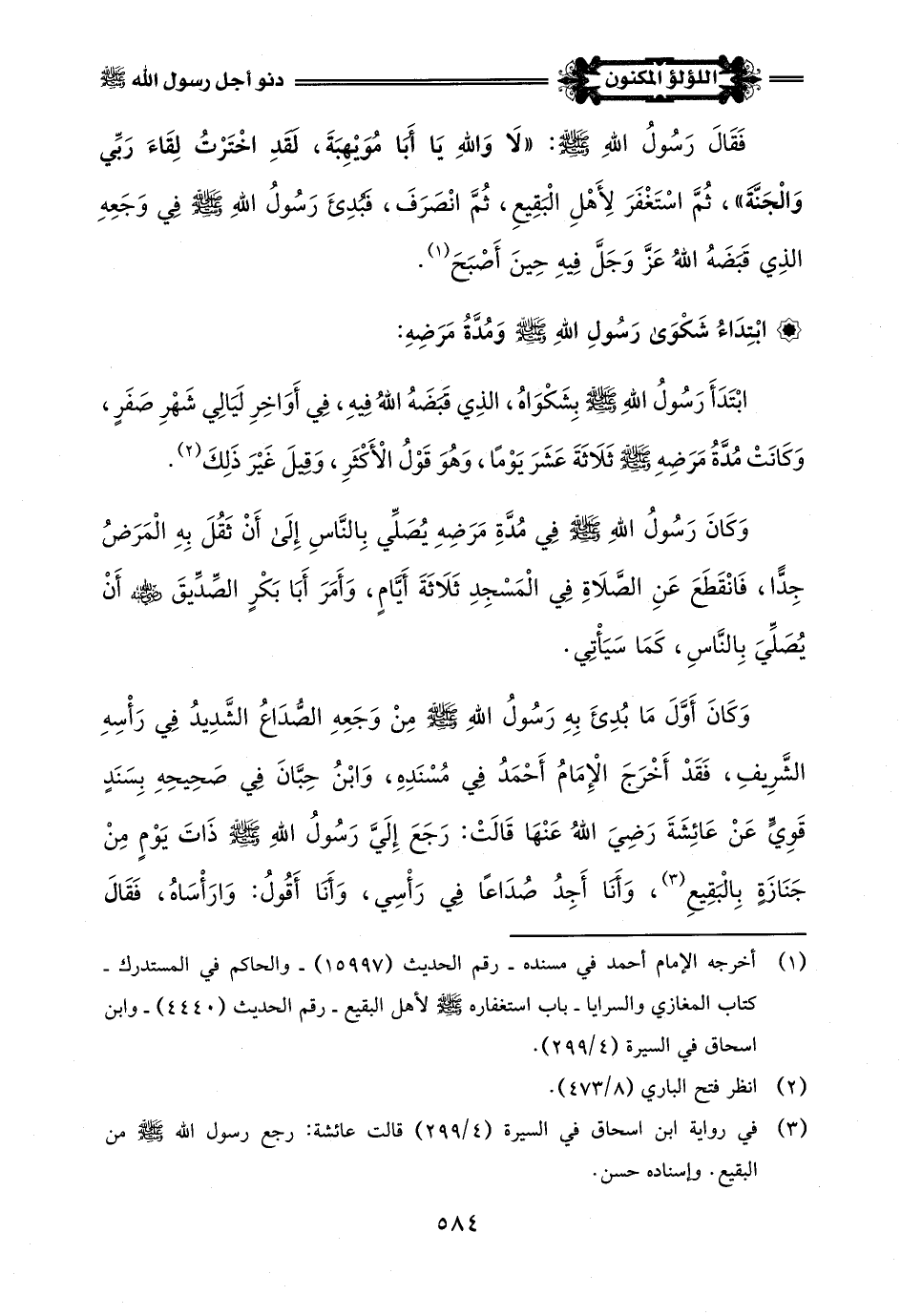 (¬1) أخرجه الإِمام أحمد في مسنده - رقم الحديث (25908) - وابن حبان في صحيحه - كتاب التاريخ - باب مرض النبي -صلى اللَّه عليه وسلم- رقم الحديث (6586) - وابن اسحاق في السيرة (4/ 300) - وأصله في صحيح البخاري - كتاب المرضى - باب ما رُخِّصَ للمريض أن يقول. . . - رقم الحديث (5666) - وكتاب الأحكام - باب الاستخلاف - رقم الحديث (7217).