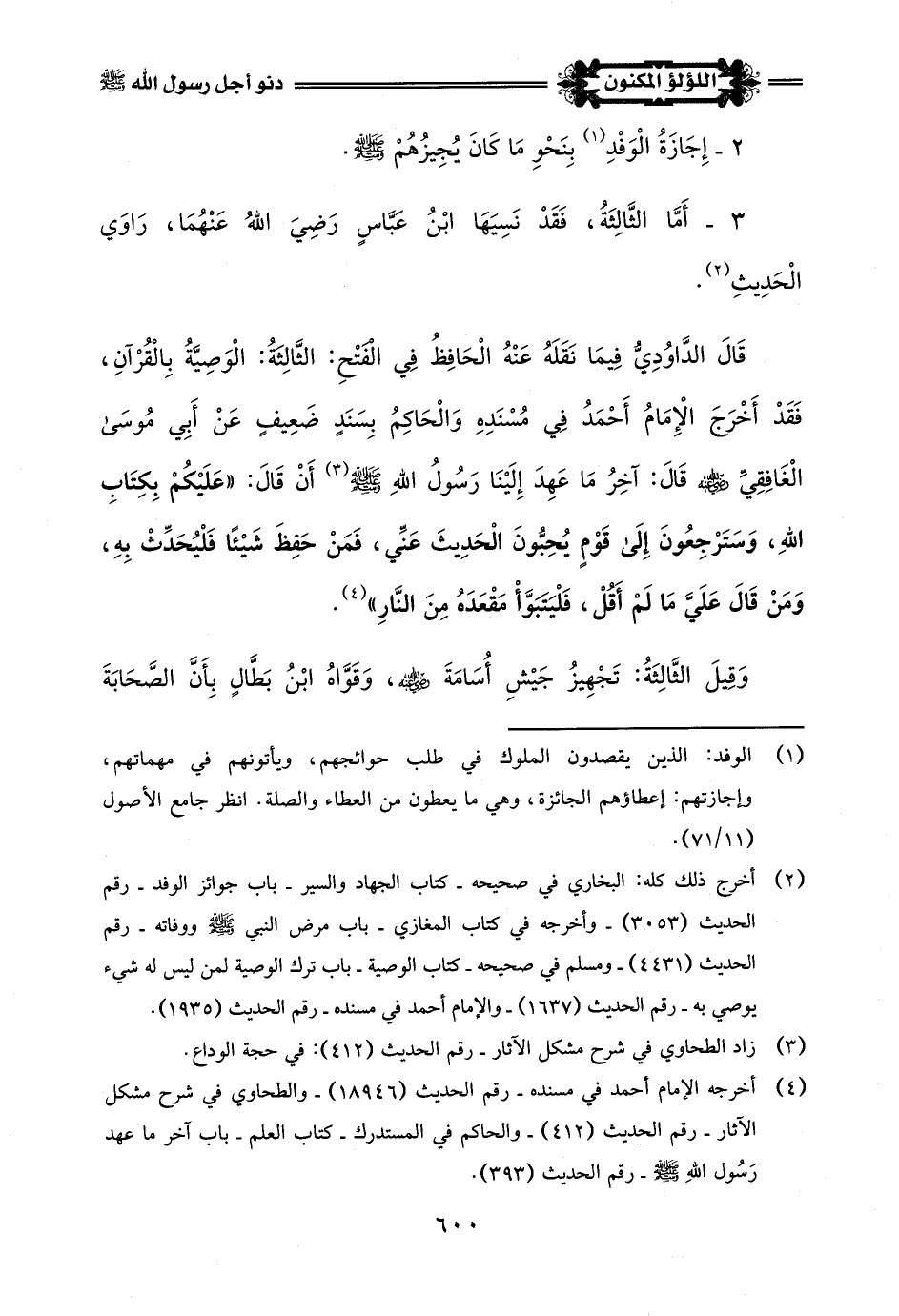 (¬2) أخرجه ابن ماجه في سننه - كتاب الوصايا - باب هل أوصى رَسُول اللَّهِ -صلى اللَّه عليه وسلم-؟ رقم الحديث (2697) عن أنس -رضي اللَّه عنه- وإسناده صحيح - وأخرجه الإِمام أحمد في مسنده - رقم الحديث (26483) - وابن ماجه في سننه - كتاب الجنائز - باب ما جاء في ذكر مرض رَسُول اللَّهِ -صلى اللَّه عليه وسلم- رقم الحديث (1625) عن أم سلمة رَضِيَ اللَّهُ عَنْهَا - وإسناده صحيح على شرط مسلم - وأخرجه الإِمام أحمد في مسنده - رقم الحديث (585) عن علي بن أبي طالب -رضي اللَّه عنه- وإسناده حسن. وانظر فتح الباري (8/ 480).