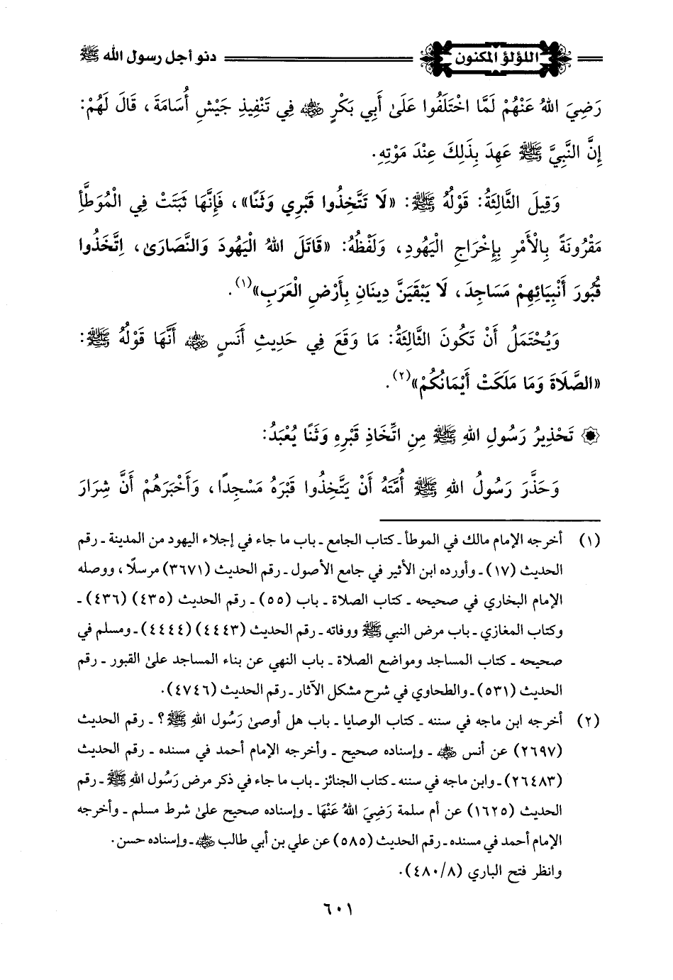 (¬4) أخرجه البخاري في صحيحه - كتاب الجنائز - باب ما يكره من اتخاذ المساجد على القبور - رقم الحديث (1330) - وباب ما جاء في قبر النبي -صلى اللَّه عليه وسلم-. . . - رقم الحديث (1390) - ومسلم في صحيحه - كتاب المساجد ومواضع الصلاة - باب النهي عن بناء المساجد على القبور - رقم الحديث (529).