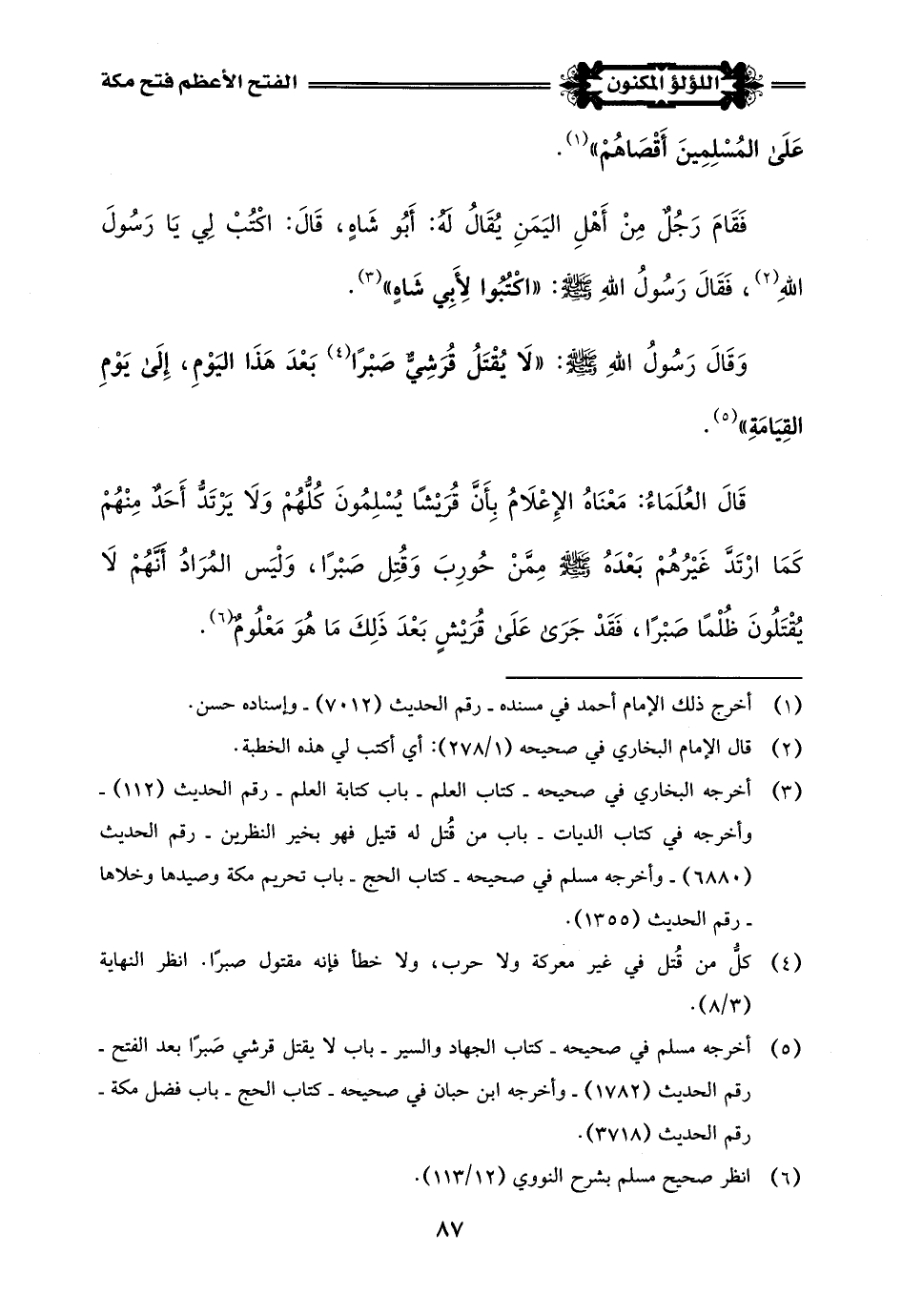 (¬2) أخرج ذلك الإمام أحمد في مسنده - رقم الحديث (7242) (16376) (16377) - والطحاوي في شرح مشكل الآثار - رقم الحديث (4901) (4903)، وأصله في صحيح البخاري - كتاب العلم - باب ليبلغ الشاهد الغائب - رقم الحديث (104) - وباب كتابة العلم - رقم الحديث (112) - وكتاب جزاء الصيد - باب لا يعضد شجر الحرم - رقم الحديث (1832) - ومسلم في صحيحه - كتاب الحج - باب تحريم مكة وصيدها وخلاها - رقم الحديث (1355) (448).