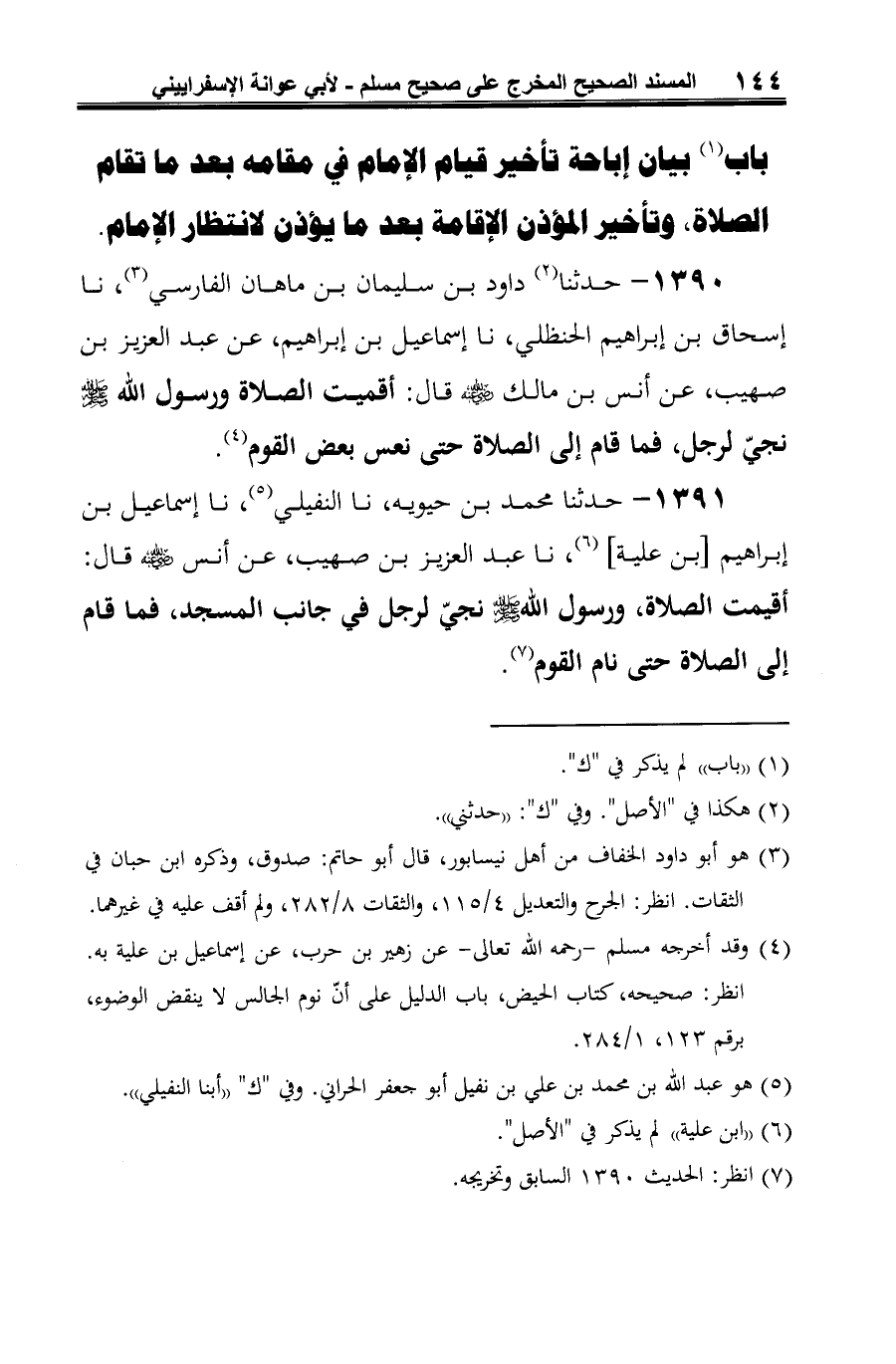 1390 - حدثنا (¬1) داود بن سليمان بن ماهان الفارسي (¬2)، نا إسحاق بن إبراهيم الحنظلي، نا إسماعيل بن إبراهيم، عن عبد العزيز بن صهيب، عن أنس بن مالك -رضي الله عنه- قال: أقميت الصلاة ورسول الله -صلى الله عليه وسلم- نجيّ لرجل، فما قام إلى الصلاة حتى نعس بعض القوم (¬3).