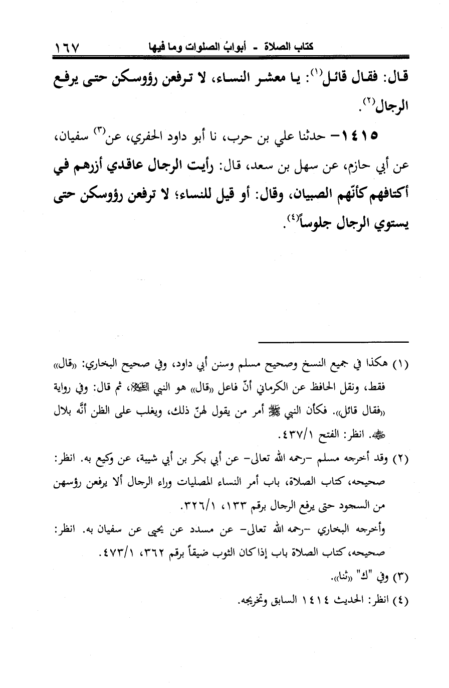 1415 - حدثنا علي بن حرب، نا أبو داود الحفري، عن (¬1) سفيان، عن أبي حازم، عن سهل بن سعد، قال: رأيت الرجال عاقدي أزرهم في أكتافهم كأنّهم الصبيان، وقال: أو قيل للنساء؛ لا ترفعن رؤوسكن حتى يستوي الرجال جلوسًا (¬2).