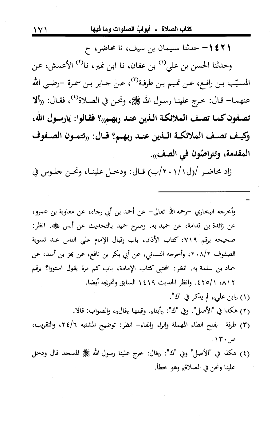وحدثنا الحسن بن علي (¬1) بن عفان، نا ابن نمير، نا (¬2) الأعمش، عن المسيّب بن رافع، عن تميم بن طرفة (¬3)، عن جابر بن سمرة -رضي الله عنهما- قال: خرج علينا رسول الله -صلى الله عليه وسلم-، ونحن في الصلاة (¬4)، فقال: "ألا تصفون كما تصف الملائكة الذين عند ربهم"؟ فقالوا: يا رسول الله، كيف تصف الملائكة الذين عند ربهم؟ قال: "تتمون الصفوف المقدمة، وتتراصّون في الصف".