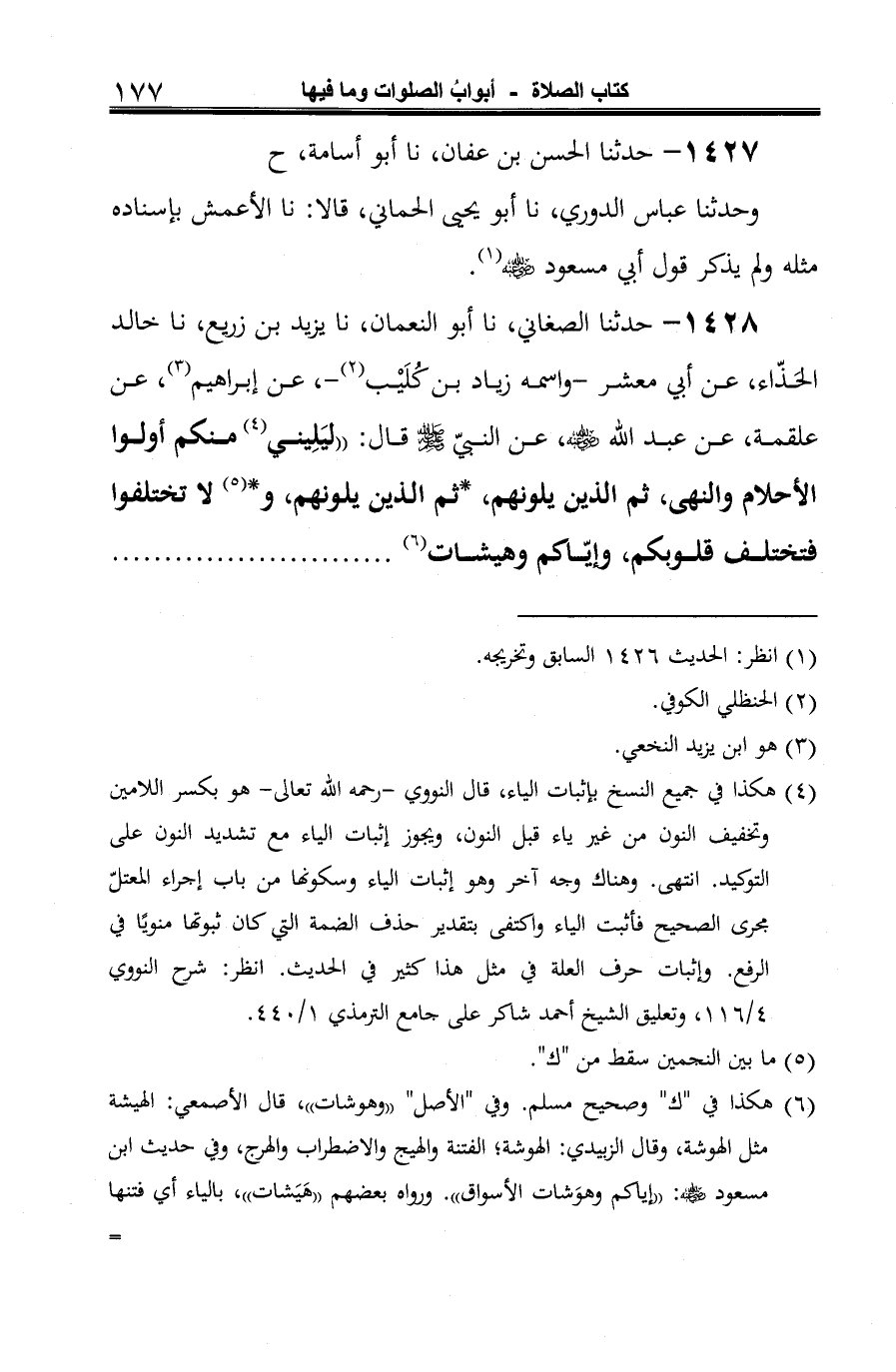 1428 - حدثنا الصغاني، نا أبو النعمان، نا يزيد بن زريع، نا خالد الحَذّاء، عن أبي معشر -واسمه زياد بن كُلَيْب (¬1) -، عن إبراهيم (¬2)، عن علقمة، عن عبد الله -رضي الله عنه-، عن النبي -صلى الله عليه وسلم- قال: "ليَلِيني (¬3) منكم أولوا الأحلام والنهى، ثم الذين يلونهم، * ثم الذين يلونهم، و* (¬4) لا تختلفوا فتختلف قلوبكم، وإيّاكم وهيشات (¬5)