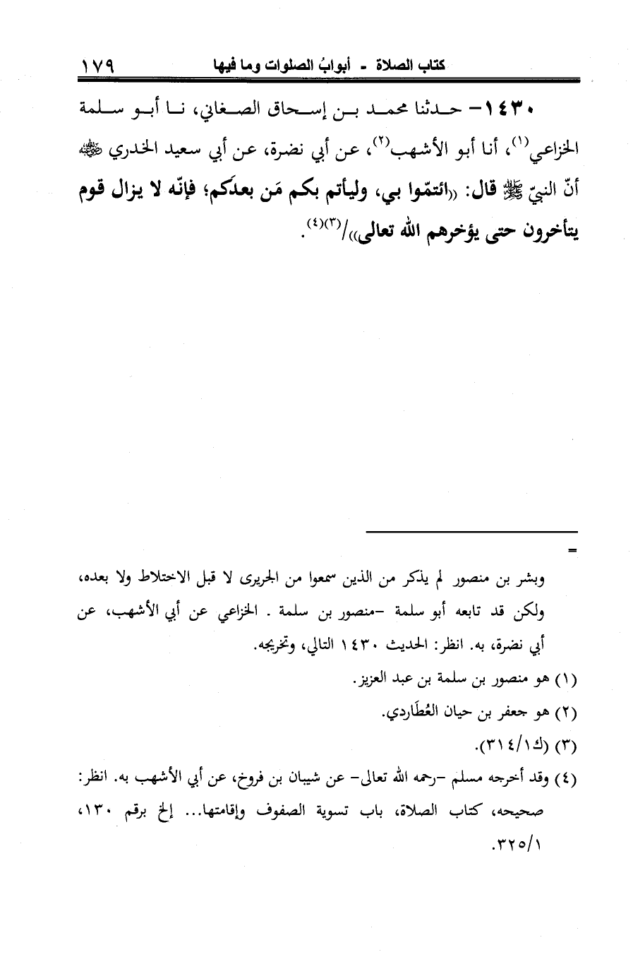 1430 - حدثنا محمد بن إسحاق الصغاني، نا أبو سلمة الخزاعي (¬1)، أنا أبو الأشهب (¬2)، عن أبي نضرة، عن أبي سعيد الخدري -رضي الله عنه- أنّ النبي -صلى الله عليه وسلم- قال: "ائتمّوا بي، وليأتم بكم مَن بعدكَم؛ فإنّه لا يزال قوم يتأخرون حتى يؤخرهم الله تعالى" (¬3) (¬4).