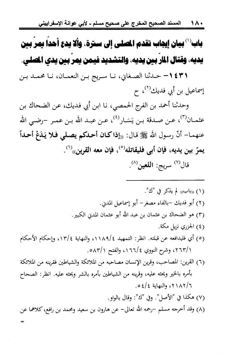-[181]- = محمد بن إسماعيل بن أبي فديك به. انظر: صحيحه، كتاب الصلاة، باب منع المار بين يدي المصلي، برقم 260، 1/ 363.