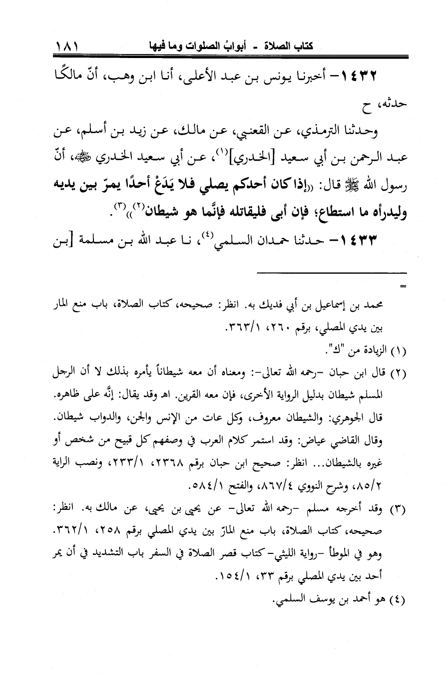 (¬3) وقد أخرجه مسلم -رحمه الله تعالى- عن يحيى بن يحيى، عن مالك به. انظر: صحيحه، كتاب الصلاة، باب منع المارّ بين يدي المصلي برقم 258، 1/ 362.