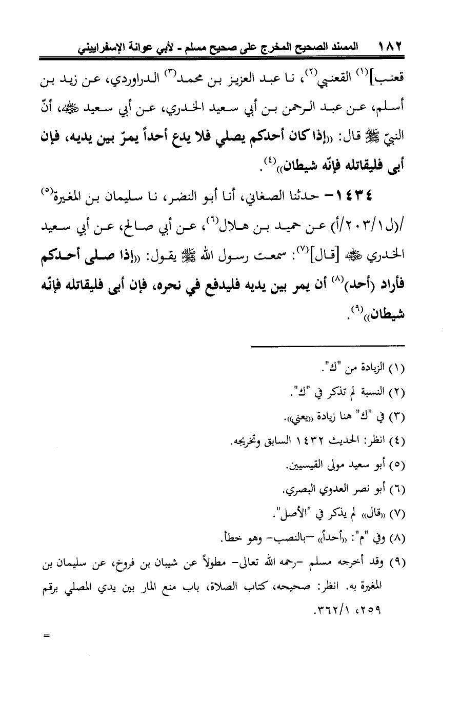 1434 - حدثنا الصغاني، أنا أبو النضر، نا سليمان بن المغيرة (¬1) عن حميد بن هلال (¬2)، عن أبي صالح، عن أبي سعيد الخدري -رضي الله عنه-[قال] (¬3): سمعت رسول الله -صلى الله عليه وسلم- يقول: "إذا صلى أحدكم فأراد (أحد) (¬4) أن يمر بين يديه فليدفع في نحره، فإن أبى فليقاتله فإنّه شيطان" (¬5).