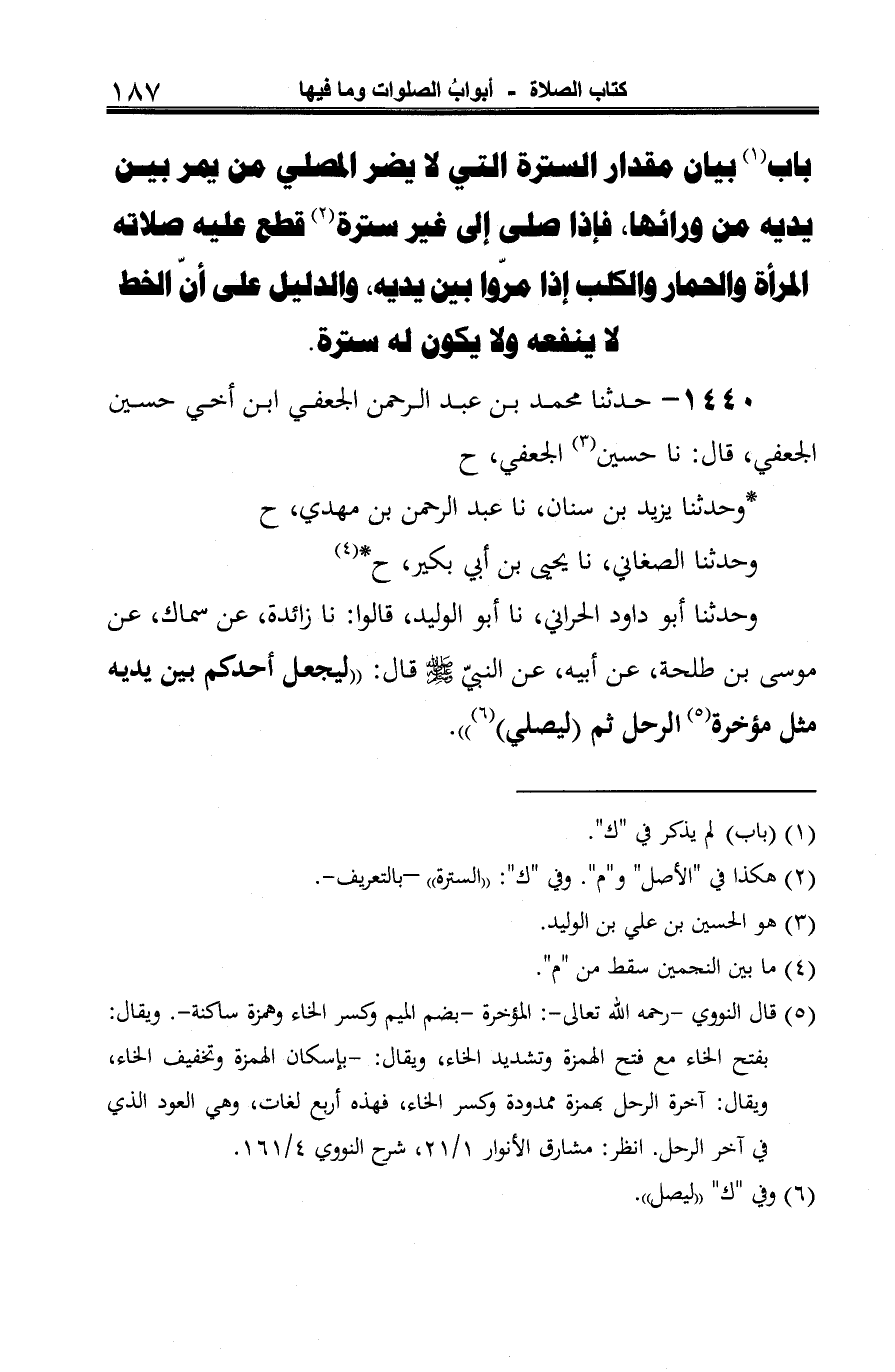 -[188]- وفي حديث الجعفي قال: "بينه وبين القبلة مؤخرة الرحل ثم لا يضرّه مَن مرّ بين يديه" (¬5).