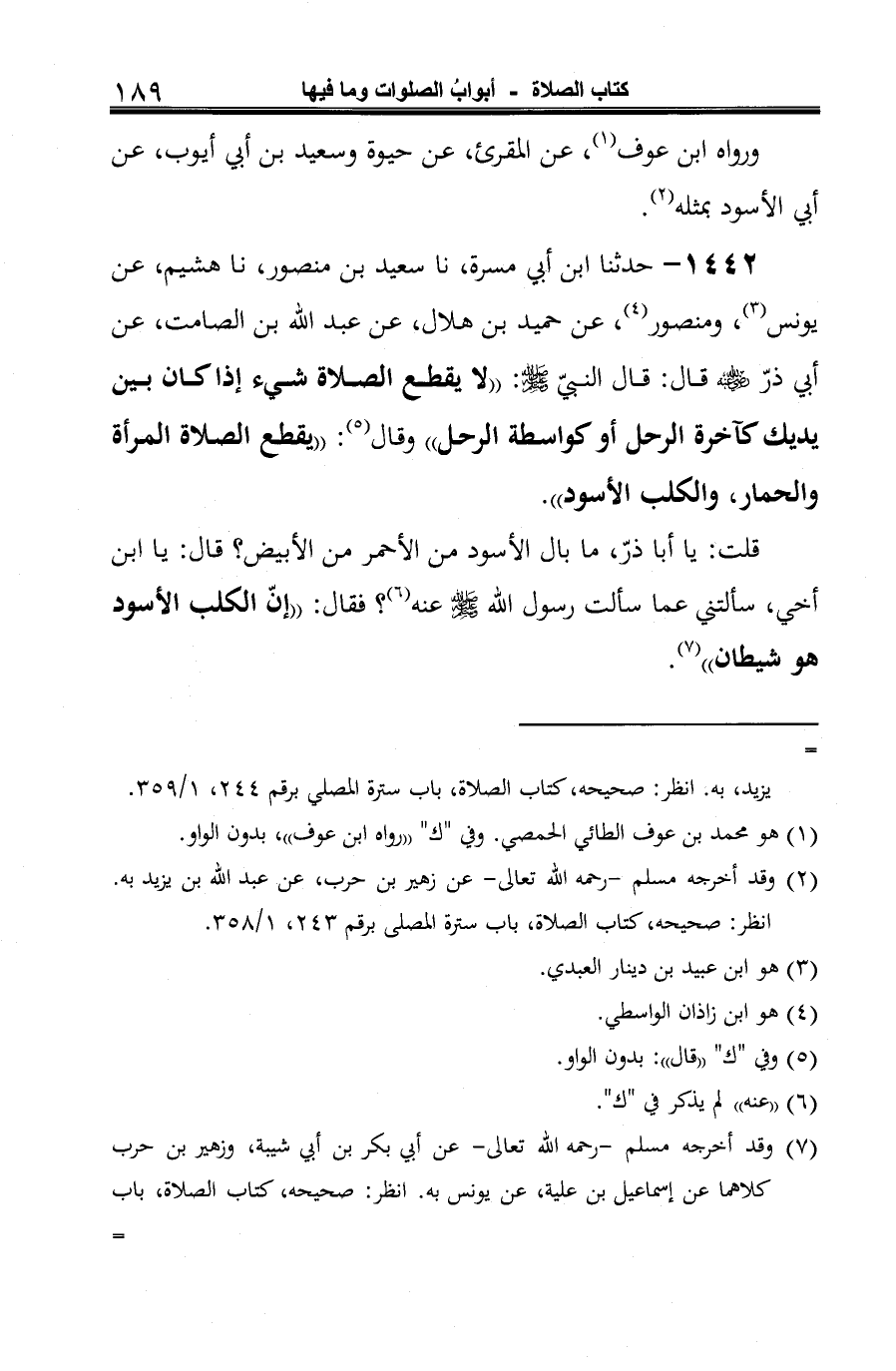 1442 - حدثنا ابن أبي مسرة، نا سعيد بن منصور، نا هشيم، عن يونس (¬1)، ومنصور (¬2)، عن حميد بن هلال، عن عبد الله بن الصامت، عن أبي ذرّ -رضي الله عنه- قال: قال النبيّ -صلى الله عليه وسلم-: "لا يقطع الصلاة شيء إذا كان بين يديك كآخرة الرحل أو واسطة الرحل" وقال (¬3): "يقطع الصلاة المرأة والحمار، والكلب الأسود".