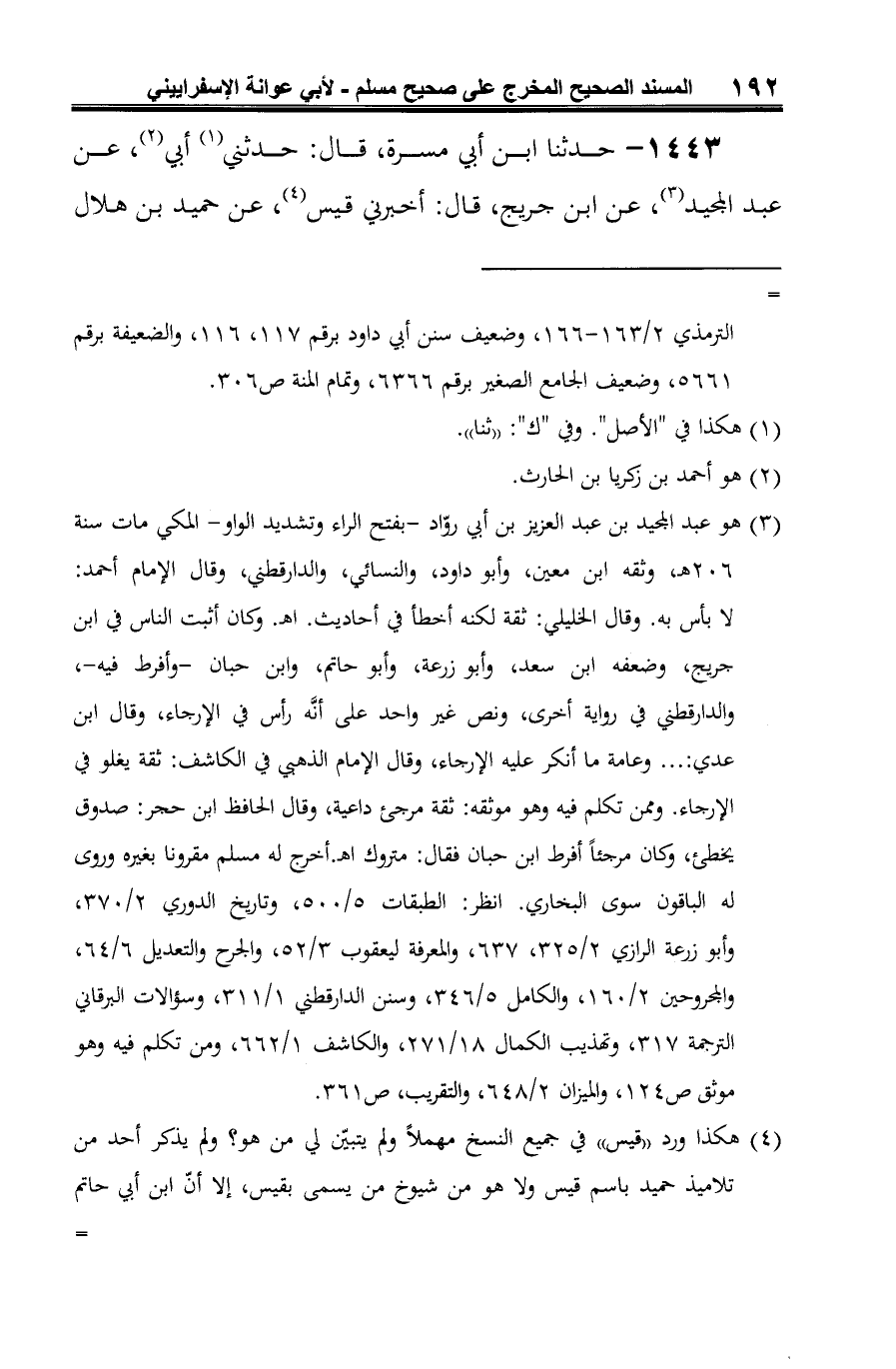 (¬3) هو عبد المجيد بن عبد العزيز بن أبي روّاد -بفتح الراء وتشديد الواو- المكي مات سنة 206 هـ، وثقه ابن معين، وأبو داود، والنسائي، والدارقطني، وقال الإمام أحمد: لا بأس به. وقال الخليلي: ثقة لكنه أخطأ في أحاديث. اهـ. وكان أثبت الناس في ابن جريج، وضعفه ابن سعد، وأبو زرعة، وأبو حاتم، وابن حبان -وأفرط فيه-، والدارقطني في رواية أخرى، ونص غير واحد على أنَّه رأس في الإرجاء، وقال ابن عدي: ... وعامة ما أنكر عليه الإرجاء، وقال الإمام الذهبي في الكاشف: ثقة يغلو في الإرجاء. وممن تكلم فيه وهو موثقه: ثقة مرجئ داعية، وقال الحافظ ابن حجر: صدوق يخطئ، وكان مرجئًا أفرط ابن حبان فقال: متروك اهـ. أخرج له مسلم مقرونا بغيره وروى له الباقون سوى البخاري. انظر: الطبقات 5/ 500، وتاريخ الدوري 2/ 370، وأبو زرعة الرازي 2/ 325، 637، والمعرفة ليعقوب 3/ 52، والجرح والتعديل 6/ 64، والمجروحين 2/ 160، والكامل 5/ 346، وسنن الدارقطني 1/ 311، وسؤالات البرقاني الترجمة 317، وتهذيب الكمال 18/ 271، والكاشف 1/ 662، ومن تكلم فيه وهو موثق ص 124، والميزان 2/ 648، والتقريب، ص 361.