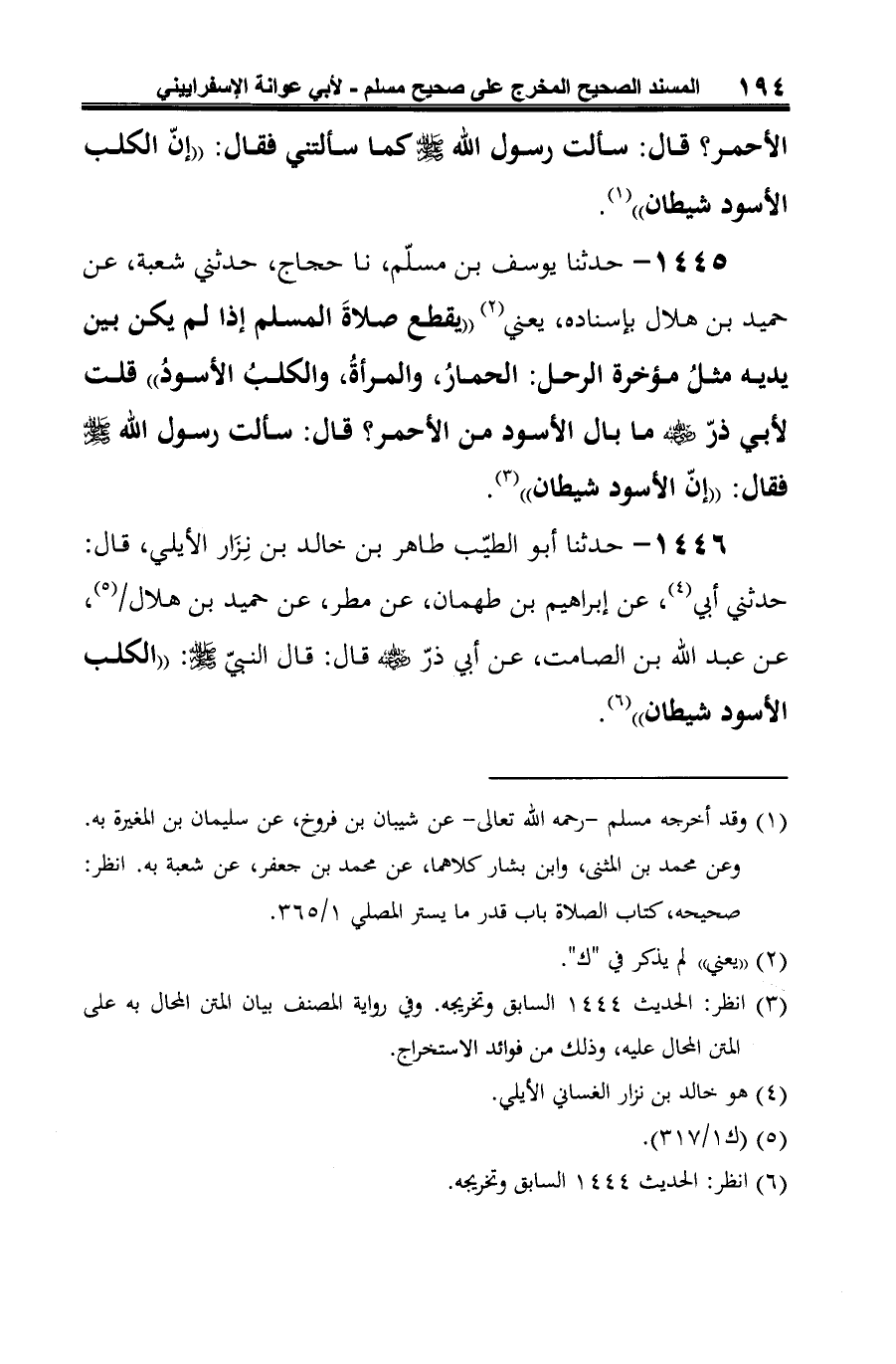 1446 - حدثنا أبو الطيّب طاهر بن خالد بن نِزَار الأيلي، قال: حدثني أبي (¬1)، عن إبراهيم بن طهمان، عن مطر، عن حميد بن هلال (¬2)، عن عبد الله بن الصامت، عن أبي ذرّ -رضي الله عنه- قال: قال النيب -صلى الله عليه وسلم-: "الكلب الأسود شيطان" (¬3).