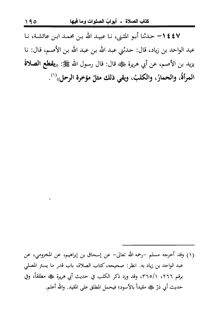 1447 - حدثنا أبو المثنى، نا عبيد الله بن محمد ابن عائشة، نا عبد الواحد بن زياد، قال: حدثني عبد الله بن عبد الله بن الأصم، قال: نا يزيد بن الأصم، عن أبي هريرة -رضي الله عنه- قال: قال رسول الله -صلى الله عليه وسلم-: "يقطع الصلاةَ المرأةُ، والحمارُ، والكلبُ، ويقي ذلك مثلُ مؤخرة الرحل" (¬1).