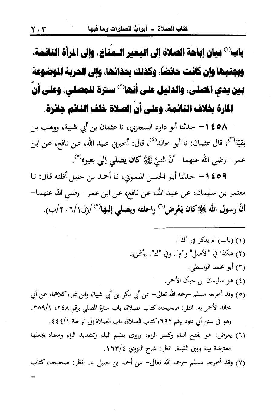 1458 - حدثنا أبو داود السجزي، نا عثمان بن أبي شيبة، ووهب بن بقيّة (¬1)، قال عثمان: نا أبو خالد (¬2)، قال: أخبرني عبيد الله، عن نافع، عن ابن عمر -رضي الله عنهما- أنّ النبي -صلى الله عليه وسلم- كان يصلي إلى بعيره (¬3).