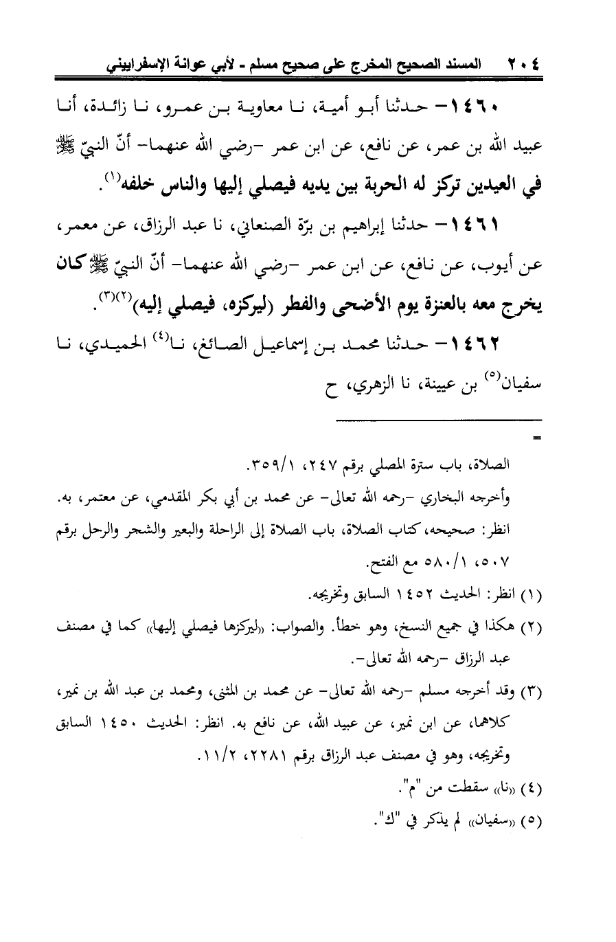 1460 - حدثنا أبو أمية، نا معاوية بن عمرو، نا زائدة، أنا عبيد الله بن عمر، عن نافع، عن ابن عمر -رضي الله عنهما- أنّ النبيّ -صلى الله عليه وسلم- في العيدين تركز له الحربة بين يديه فيصلي إليها والناس خلفه (¬1).