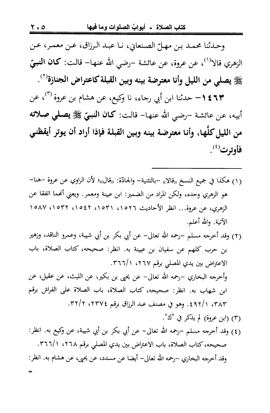 1463 - حدثنا ابن أبي رجاء، نا وكيع، عن هشام بن عروة (¬1)، عن أبيه، عن عائشة -رضي الله عنها- قالت: كان النبيّ -صلى الله عليه وسلم- يصلي صلاته من الليل كلَّها، وأنا معترضة بينه وبين القبلة فإذا أراد أن يوتر أيقظني فأوترت (¬2).