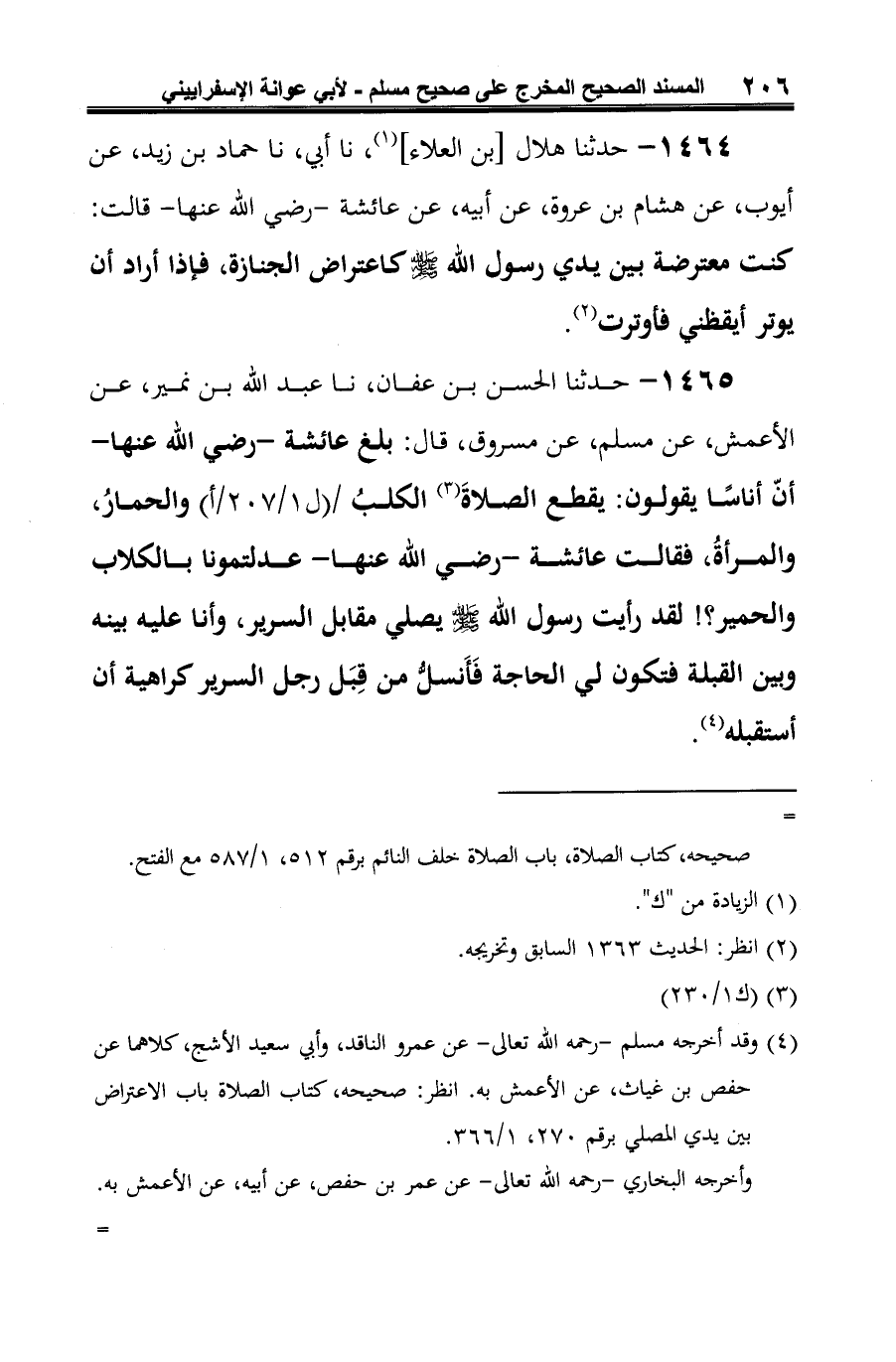 1465 - حدثنا الحسن بن عفان، نا عبد الله بن نمير، عن الأعمش، عن مسلم، عن مسروق، قال: بلغ عائشة -رضي الله عنها- أنّ أناسًا يقولون: يقطع الصلاة (¬1) الكلبُ والحمارُ، والمرأةُ، فقالت عائشة -رضي الله عنها- عدلتمونا بالكلاب والحمير؟! لقد رأيت رسول الله -صلى الله عليه وسلم- يصلي مقابل السرير، وأنا عليه بينه وبين القبلة فتكون لي الحاجة فَأَنسلُّ من قِبَل رجل السرير كراهية أن أستقبله (¬2).