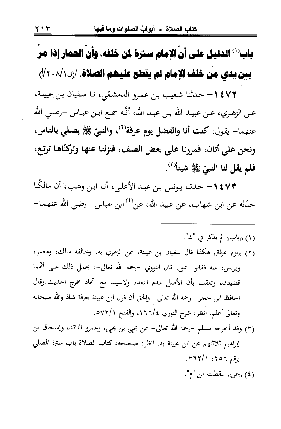 1472 - حدثنا شعيب بن عمرو الدمشقي، نا سفيان بن عيينة، عن الزهري، عن عبيد الله بن عبد الله، أنَّه سمع ابن عباس -رضي الله عنهما- يقول: كنت أنا والفضل يوم عرفة (¬1)، والنبيّ -صلى الله عليه وسلم- يصلي بالناس، ونحن على أتان، فمررنا على بعض الصف، فنزلنا عنها وتركنّاها ترتع، فلم يقل لنا النبيّ -صلى الله عليه وسلم- شيئًا (¬2).