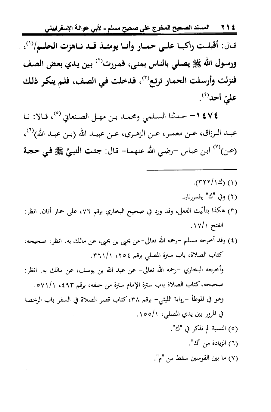 -[215]- الوداع أو قال: يوم الفتح (¬4) وهو يصلي أنا والفضل مرتدفان على أتان، فقطعنا الصف، فنزلنا عنها، ثم وصلْنا الصف، والأتان تمرّ بين أيديهم لم تقطع صلاتهم (¬5).