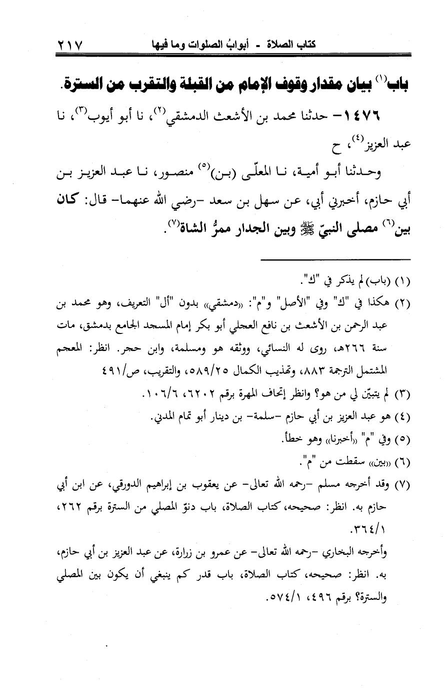 (¬6) وقد أخرجه مسلم -رحمه الله تعالى- عن يعقوب بن إبراهيم الدورقي، عن ابن أبي حازم به. انظر: صحيحه، كتاب الصلاة، باب دنوّ المصلي من السترة برقم 262، 1/ 364.