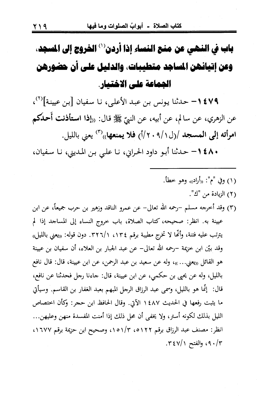 1479 - حدثنا يونس بن عبد الأعلى، نا سفيان [بن عيينة] (¬1)، عن الزهري، عن سالم، عن أبيه، عن النبي -صلى الله عليه وسلم- قال: "إذا استأذنت أَحدَكم امرأته إلى المسجد فلا يمنعها" (¬2) يعني بالليل.