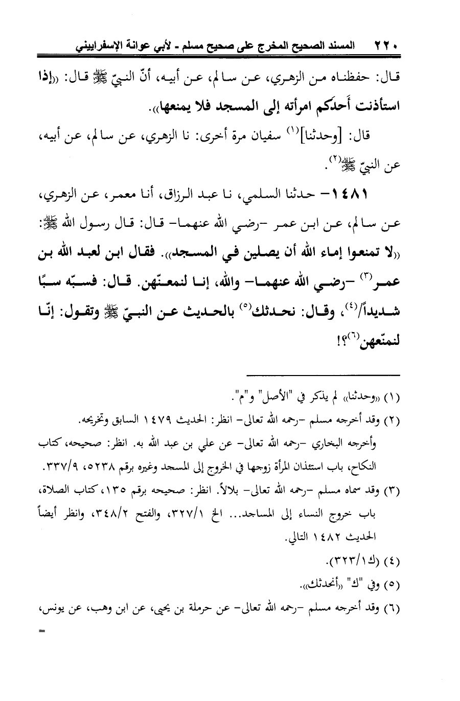 1481 - حدثنا السلمي، نا عبد الرزاق، أنا معمر، عن الزهري، عن سالم، عن ابن عمر -رضي الله عنهما- قال: قال رسول الله -صلى الله عليه وسلم-: "لا تمنعوا إماء الله أن يصلين في المسجد". فقال ابن لعبد الله بن عمر (¬1) -رضي الله عنهما- والله، إنا لنمعنّهن. قال: فسبّه سبًّا شديدًا (¬2)، وقال: نحدثك (¬3) بالحديث عن النبيّ -صلى الله عليه وسلم- وتقول: إنّا لنمنّعهن (¬4)؟!