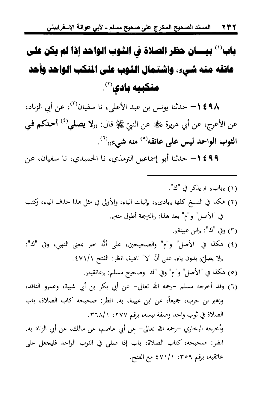 -[233]- أبي الزناد، عن الأعرج، عن أبي هريرة -رضي الله عنه- أنّ النبيّ -صلى الله عليه وسلم- قال: "لا يصلين أحدكم في الثوب الواحد ليس على عاتقيه منه شيء" (¬1).