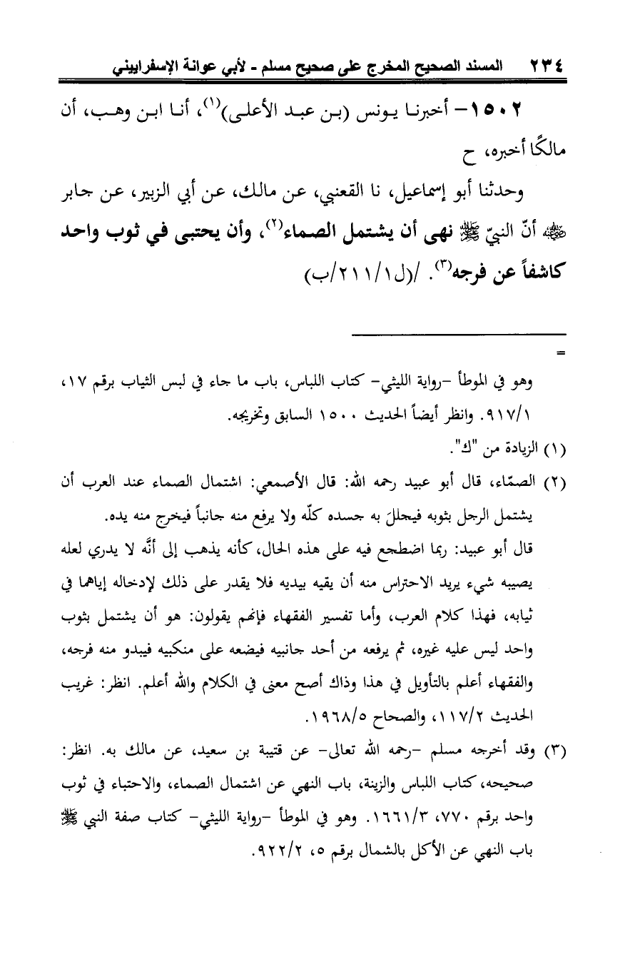 وحدثنا أبو إسماعيل، نا القعنبي، عن مالك، عن أبي الزبير، عن جابر -رضي الله عنه- أنّ النبيّ -صلى الله عليه وسلم- نهى أن يشتمل الصماء (¬2)، وأن يحتبى في ثوب واحد كاشفًا عن فرجه (¬3).