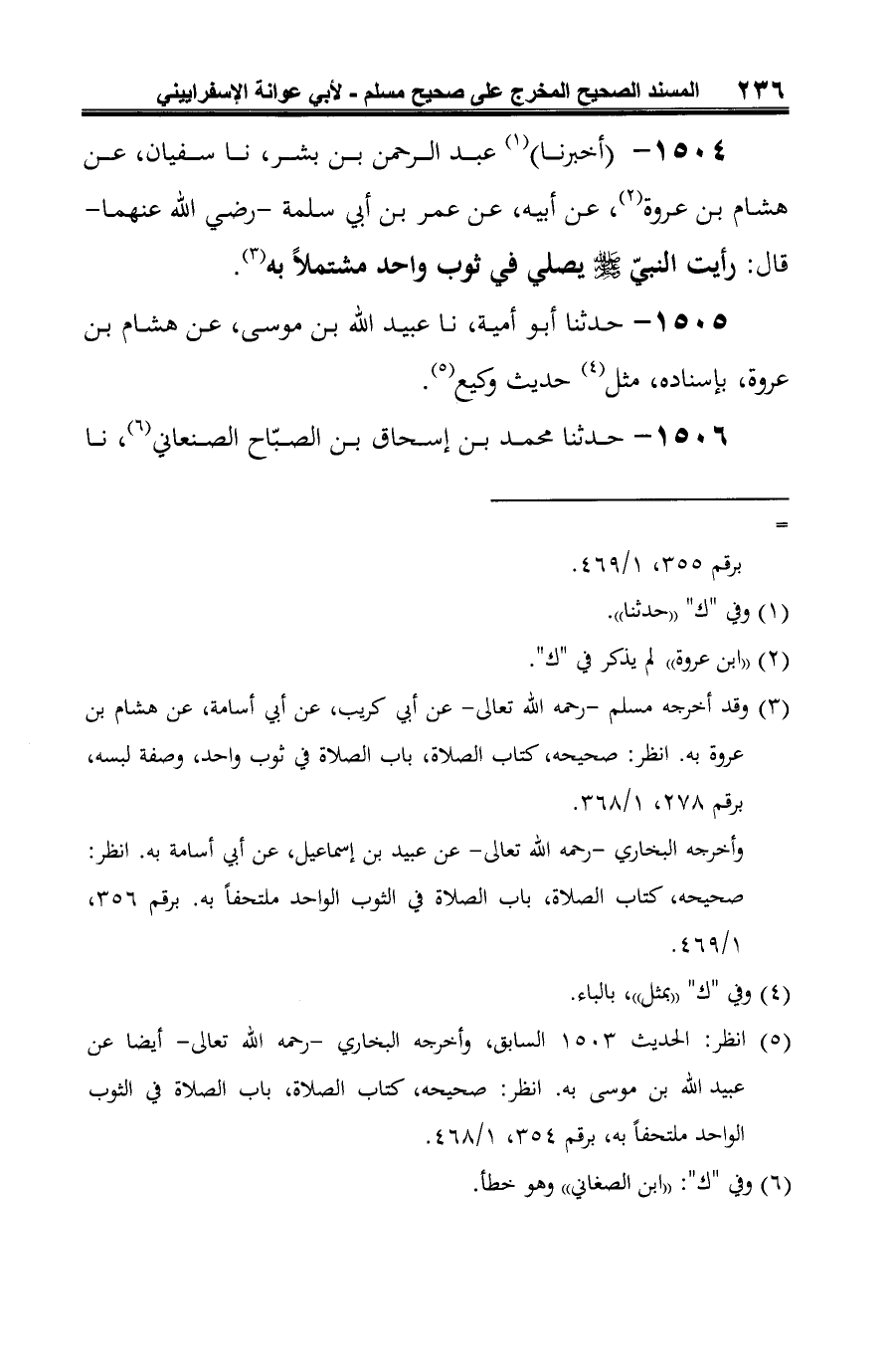(¬3) وقد أخرجه مسلم -رحمه الله تعالى- عن أبي كريب، عن أبي أسامة، عن هشام بن عروة به. انظر: صحيحه، كتاب الصلاة، باب الصلاة في ثوب واحد، وصفة لبسه، برقم 278، 1/ 368.