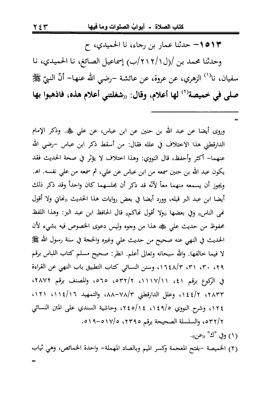 (¬5) وقد أخرجه مسلم -رحمه الله تعالى- عن عمرو الناقد، وزهير بن حرب، وأبي بكر بن أبي شيبة ثلاثتهم عن سفيان بن عيينة به. انظر: صحيحه، كتاب المساجد ومواضع الصلاة، باب كراهة الصلاة في ثوب له أعلام برقم 61، 1/ 391.