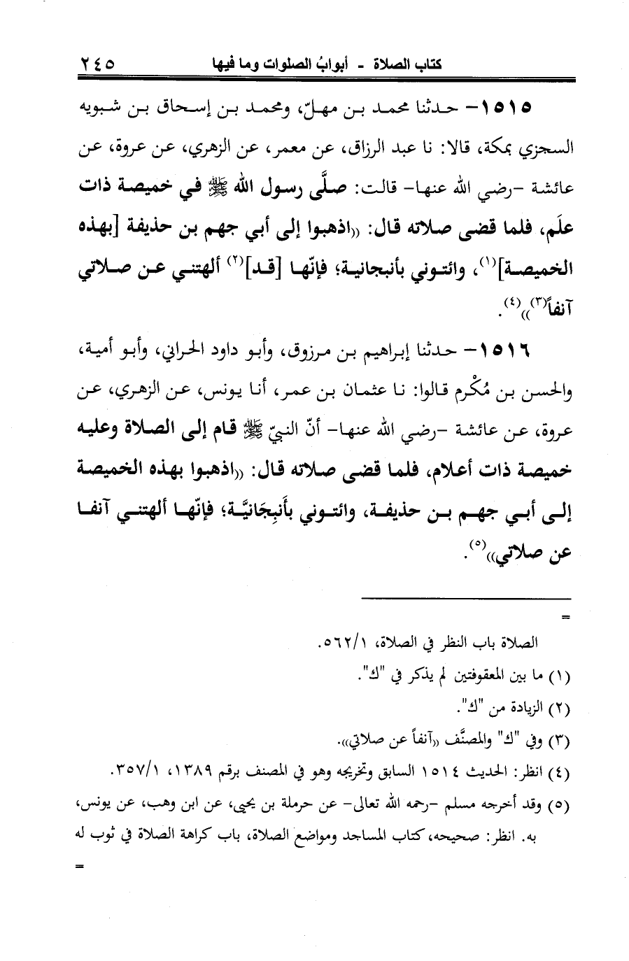 1516 - حدثنا إبراهيم بن مرزوق، وأبو داود الحراني، وأبو أمية، والحسن بن مُكْرم قالوا: نا عثمان بن عمر، أنا يونس، عن الزهري، عن عروة، عن عائشة -رضي الله عنها- أنّ النبيّ -صلى الله عليه وسلم- قام إلى الصلاة وعليه خميصة ذات أعلام، فلما قضى صلاته قال: "اذهبوا بهذه الخميصة إلى أبي جهم بن حذيفة، وائتوني بأَنبِجَانيَّة، فإنّها ألهتني آنفا عن صلاتي" (¬1).