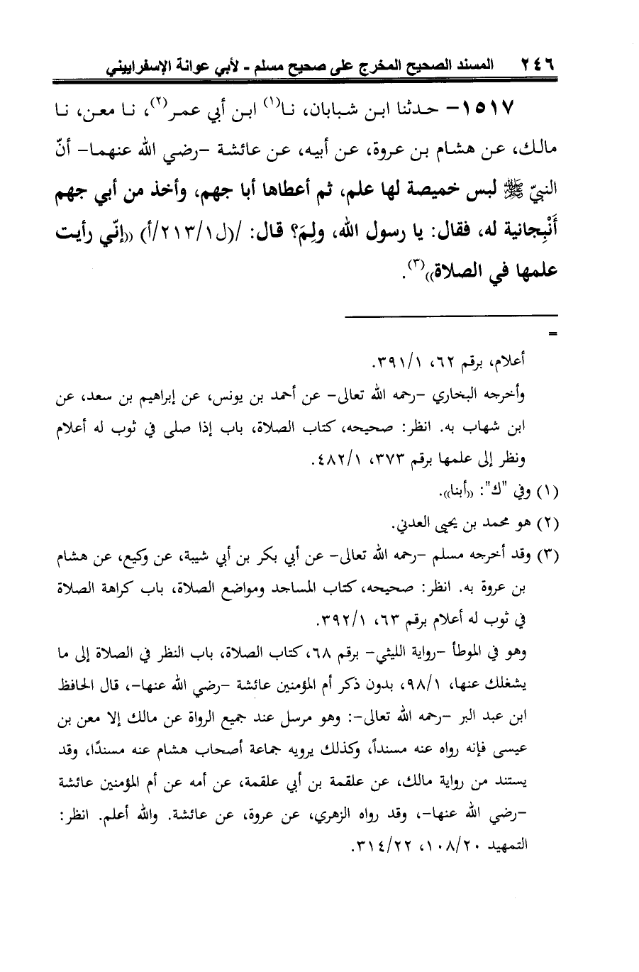 1517 - حدثنا ابن شبابان، نا (¬1) ابن أبي عمر (¬2)، نا معن، نا مالك، عن هشام بن عروة، عن أبيه، عن عائشة -رضي الله عنهما- أنّ النبي -صلى الله عليه وسلم- لبس خميصة لها علم، ثم أعطاها أبا جهم، وأخذ من أبي جهم أَنْبِجانية له، فقال: يا رسول الله، ولِمَ؟ قال: "إنّي رأيت علمها في الصلاة" (¬3).