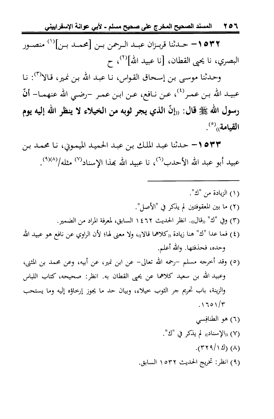 (¬5) وقد أخرجه مسلم -رحمه الله تعالى- عن ابن نمير، عن أبيه، وعن محمد بن المثنى، وعبيد الله بن سعيد كلاهما عن يحيى القطان به. انظر: صحيحه، كتاب اللباس والزينة، باب تحريم جر الثوب خيلاء، وبيان حد ما يجوز إرخاؤه إليه وما يستحب 3/ 1651.