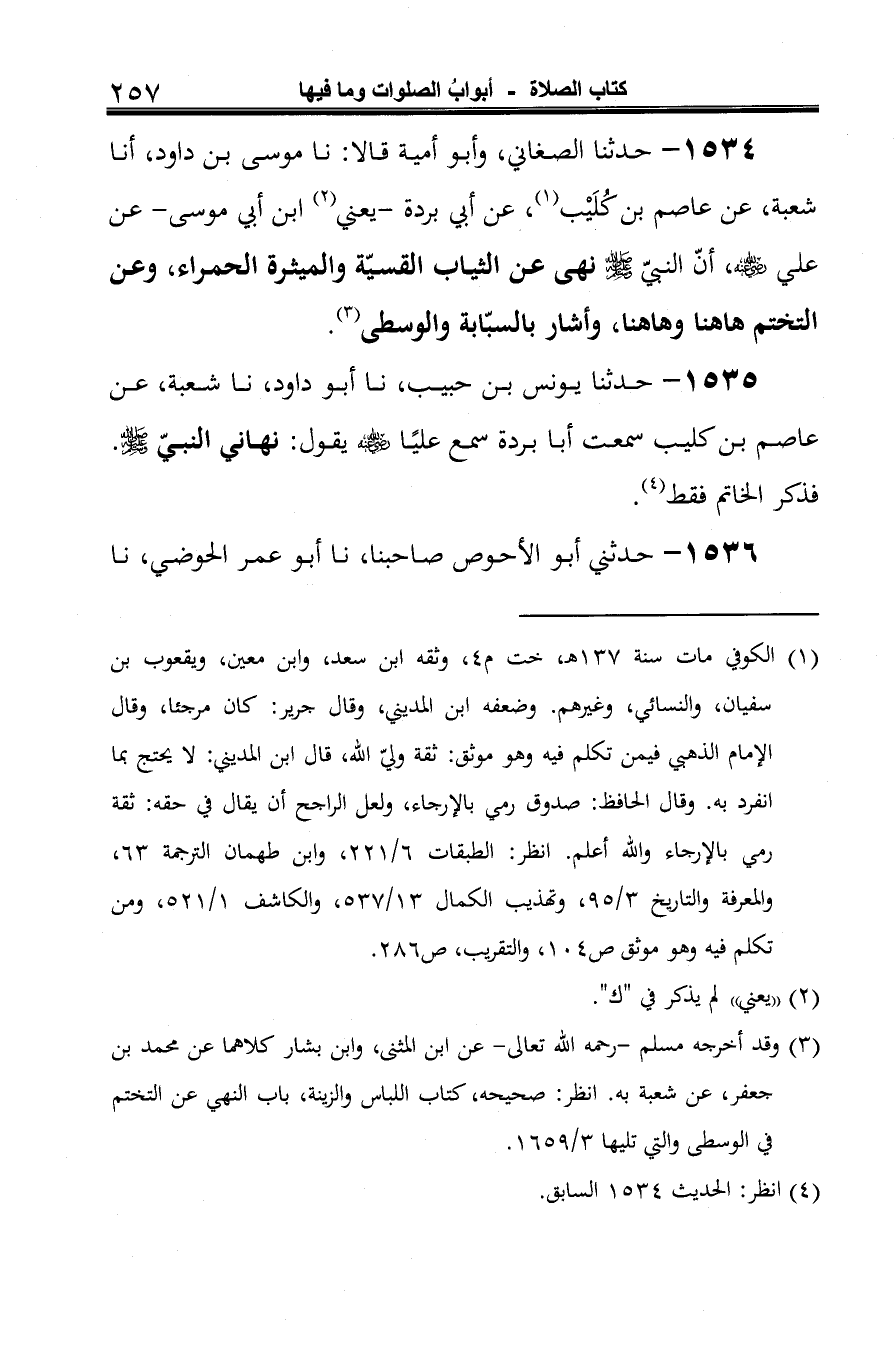 1534 - حدثنا الصغاني، وأبو أمية قالا: نا موسى بن داود، أنا شعبة، عن عاصم بن كُلَيْب (¬1)، عن أبي بردة -يعني (¬2) ابن أبي موسى- عن علي -رضي الله عنه-، أنّ النبيّ -صلى الله عليه وسلم- نهى عن الثياب القسيّة والميثرة الحمراء، وعن التختم ها هنا وها هنا، وأشار بالسبّابة والوسطى (¬3).