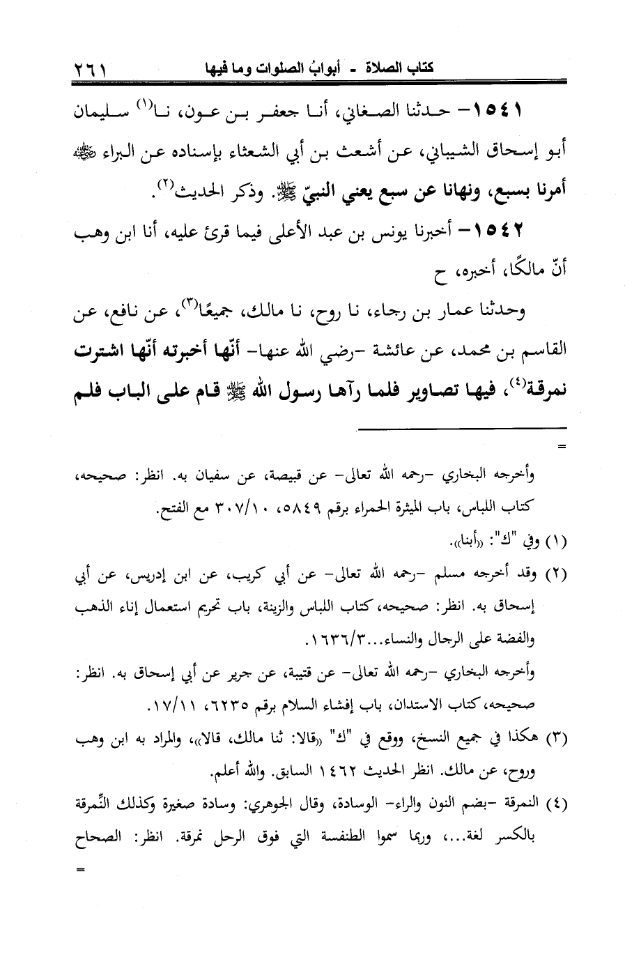 وحدثنا عمار بن رجاء، نا روح، نا مالك، جميعًا (¬1)، عن نافع، عن القاسم بن محمد، عن عائشة -رضي الله عنها- أنّها أخبرته أنّها اشترت نمرقة (¬2)، فيها تصاوير فلما رآها رسول الله -صلى الله عليه وسلم- قام على الباب فلم