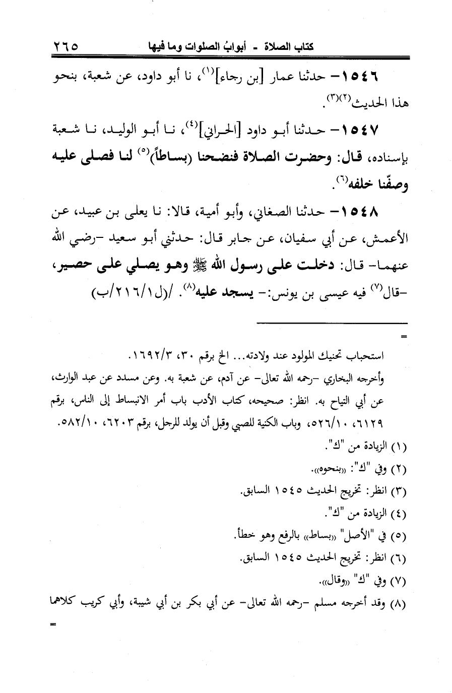 1547 - حدثنا أبو داود [الحراني] (¬1)، نا أبو الوليد، نا شعبة بإسناده، قال: وحضرت الصلاة فنضحنا (بساطًا) (¬2) لنا فصلى عليه وصفّنا خلفه (¬3).