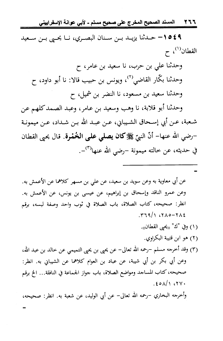 وحدثنا أبو قلابة، نا وهب وسعيد بن عامر، وعبد الصمد كلهم عن شعبة، عن أبي إسحاق الشيباني، عن عبد الله بن شداد، عن ميمونة -رضي الله عنها- أنّ النبيّ -صلى الله عليه وسلم- كان يصلي على الخُمْرة. قال يحيى القطان في حديثه، عن خالته ميمونة -رضي الله عنها (¬3) -.