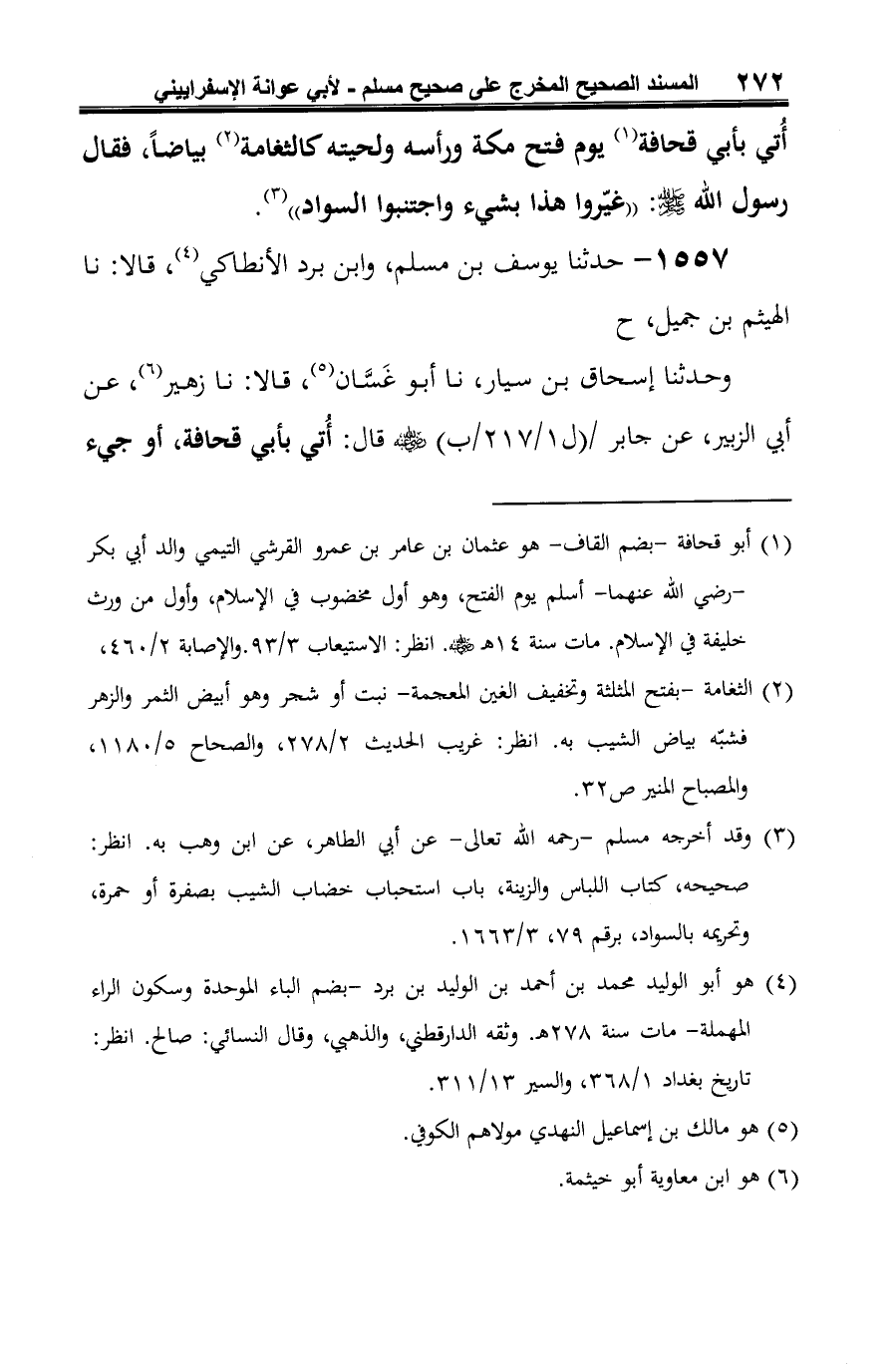 (¬5) وقد أخرجه مسلم -رحمه الله تعالى- عن يحيى بن يحيى، عن أبي خيثمة به. انظر: صحيحه، كتاب اللباس والزينة، باب استحباب خضاب الشيب بصفرة أو حمرة وتحريمه بالسواد برقم 78، 3/ 1663.