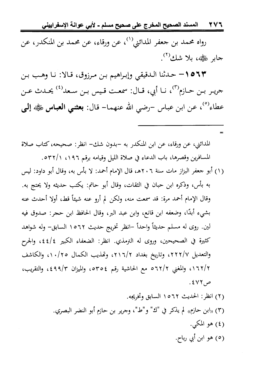 1563 - حدثنا الدقيقي وإبراهيم بن مرزوق، قالا: نا وهب بن جرير بن حازم (¬1)، نا أبي، قال: سمعت قيس بن سعد (¬2) يحدث عن عطاء (¬3)، عن ابن عباس -رضي الله عنهما- قال: بعثني العباس -رضي الله عنه- إلى
