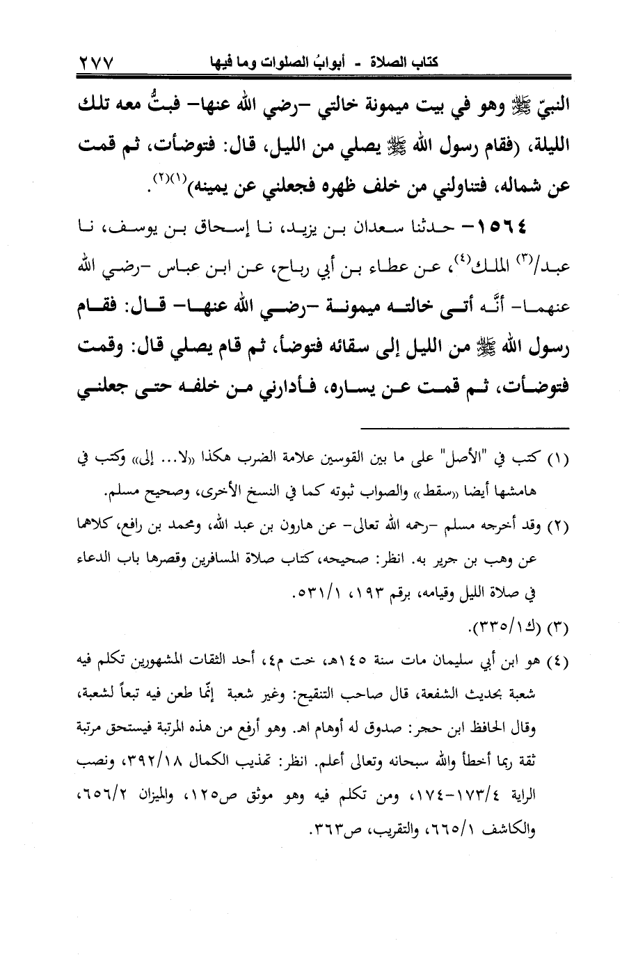 1564 - حدثنا سعدان بن يزيد، نا إسحاق بن يوسف، نا عبد (¬1) الملك (¬2)، عن عطاء بن أبي رباح، عن ابن عباس -رضي الله عنهما- أنَّه أتى خالته ميمونة -رضي الله عنها- قال: فقام رسول الله -صلى الله عليه وسلم- من الليل إلى سقائه فتوضأ، ثم قام يصلي قال: وقمت فتوضأت، ثم قمت عن يساره، فأدارني من خلفه حتى جعلني